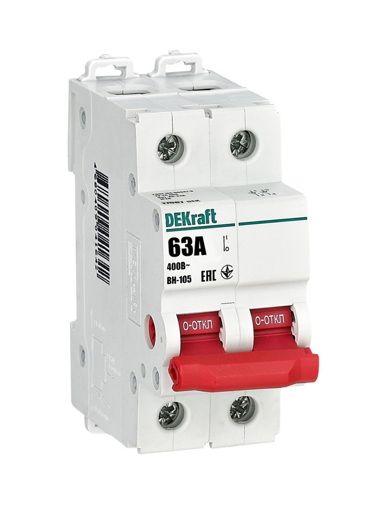 Выключатель-разъединитель серии ВН-105 Dekraft, 2-полюсный; номинальный ток 63 А, установка – на 35мм DIN-рейку, установочное положение - любое, с красной рукояткой управления. Высокие характеристики механической и электрической износостойкости. Категория применения AC-22A. Применяется для ручного включения/отключения сетей напряжением 230 В AC. Специальные мостиковые контакты обеспечивают надежный разрыв цепи; они полностью исключают возможность перекрытия дугой по изоляции.