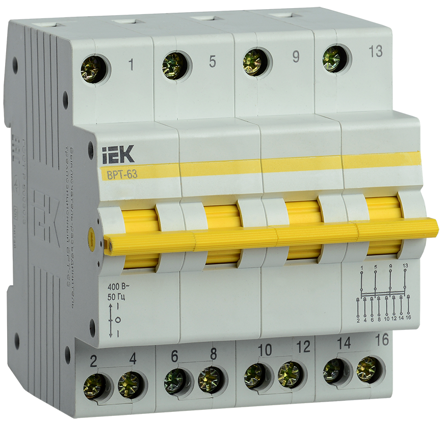 Выключатель-разъединитель трехпозиционный ВРТ-63 предназначен для коммутации смешанных активных и индуктивных нагрузок в цепях переменного тока напряжением до 400 В частотой 50 Гц. Применяется в качестве учетно-распределительного оборудования жилых и общественных зданий и сооружений, где предусматривается необходимость в оперативном отключении от сети отдельных групп электропотребителей или участков электрокоммуникации.