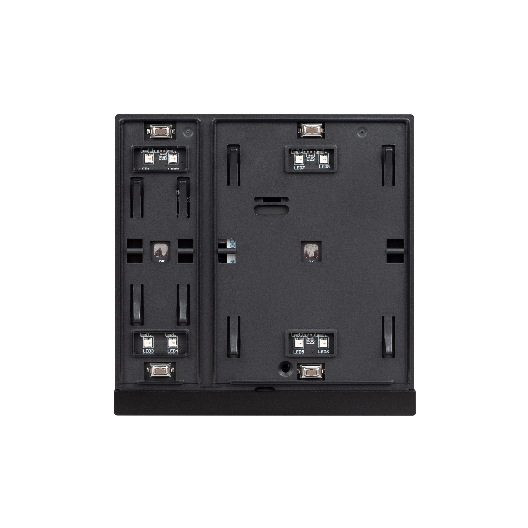 Механизм встраиваемой панели черного цвета с кнопочным управлением, предназначенная для включения и выключения световых сцен в системах управления светом KNX. Позволяет осуществлять включение/выключение, диммирование, управление шторами и жалюзи, управлять сценами. Поддерживает управление с помощью 2 настраиваемых рокерных клавиш. Каждая клавиша может выполнять функции 2-х клавиш. Устройство совместимо с исполнительными устройствами стандарта KNX, в том числе, мировых производителей ABB, SCHNEIDER ELECTRIC, SIEMENS, ZENNIO и другими. Удобное и точное управление при помощи отдельных механических кнопок для каждой функции. Питание от шины KNX. Габариты устройства составляют 86x86x33 мм, установка в стандартную монтажную коробку. Пластиковый корпус, цвет черый, безрамочный корпус, материал - пластик, светодиодная индикация.