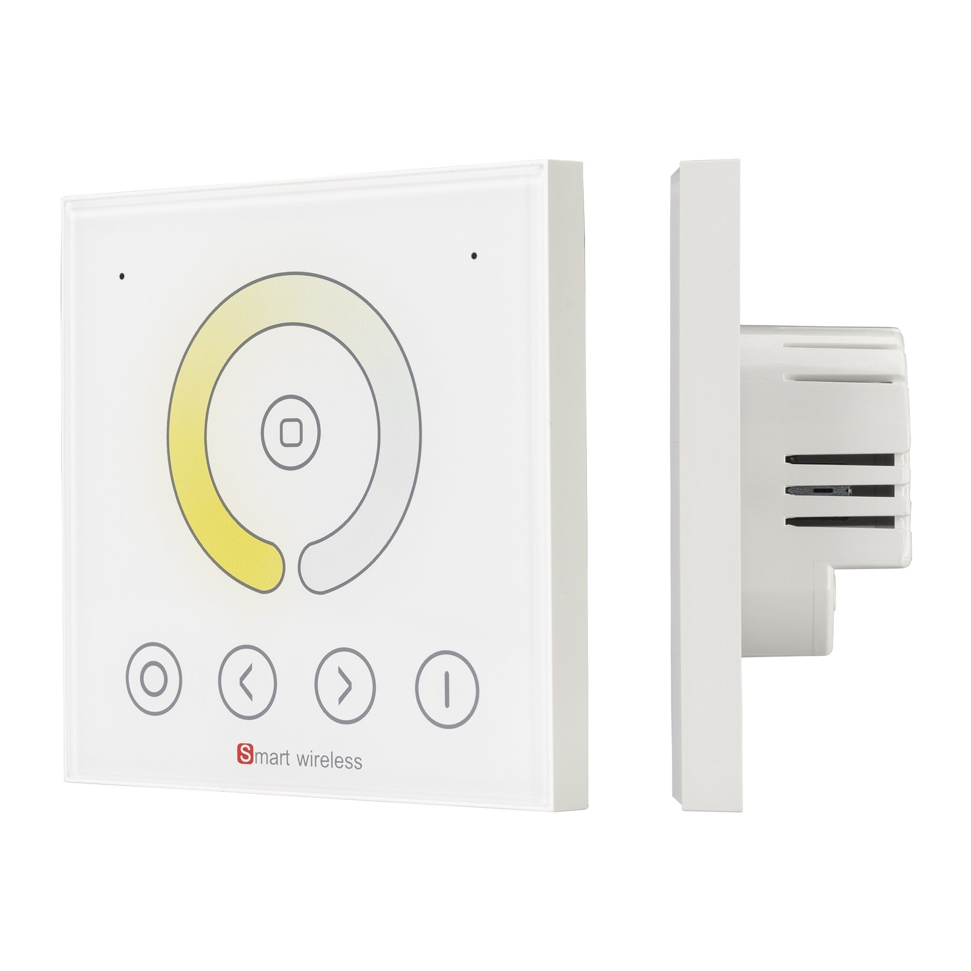 Настенная сенсорная панель со стекляным покрытием предназначена для встройки в стандартный подрозетник. С помощью панели возможно управление мультибелой светодиодной лентой - включение/выключение, регулировка яркости, изменение цветовой температуры. Панель имеет сенсорный круг для точного и легкого изменения оттенка белого цвета, кнопки переключения между 2-мя парами параллельных каналов, а также кнопки включения и выключения света. Изделие выполнено в белом цвете из высококачественного стекла, устойчивого к появлению мелких царапин и сколов. Питание панели имеет диапазон напряжений от 12В до 24В, максимальный ток 4А на 1 канал, максимальная мощность 192-384Вт (в зависимости от напряжения питания). Габариты панели составляют 86х86х33мм.