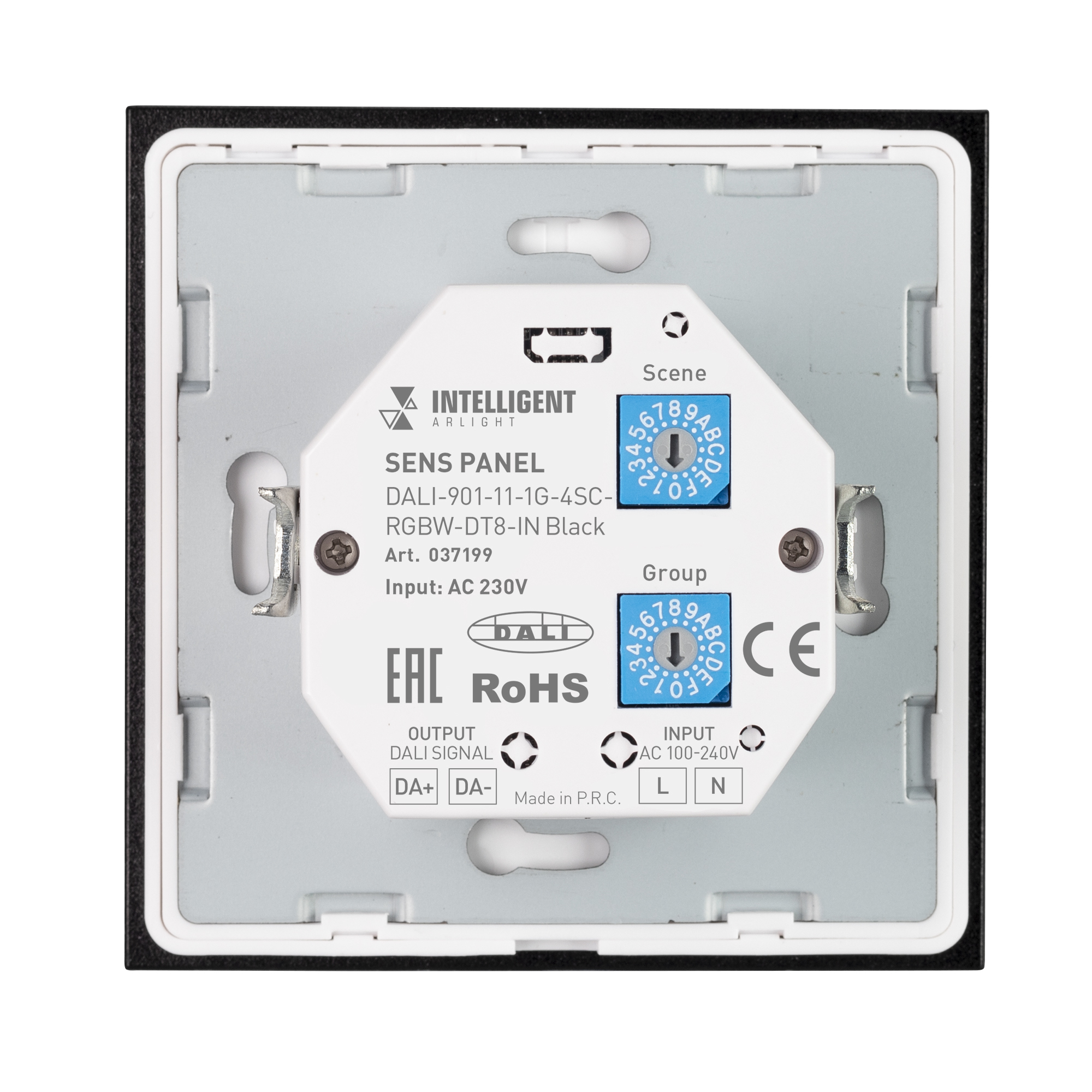 Встраиваемая стеклянная панель чёрного цвета с сенсорным управлением, предназначенная для управления мультицветным (RGBW) светодиодным или любым другим освещением в системах управления светом DALI. Позволяет включать/выключать свет, менять его яркость и управлять оттенком белого цвета по 1 группе с помощью сенсорного круга, сохранять и вызывать до 4 световых сцен. Установка адреса выполняется переключателями на задней стороне корпуса панели. Устройство совместимо с диммерами стандарта DALI. Передача команд от панели к диммерам выполняется по общей двухпроводной шине DALI. Интерфейс управления DALI DT8. Удобное и точное управление при помощи сенсорных кнопок и сенсорного круга. Питание от шины DALI либо от 230В (в этом случае, панель становится источником питания шины DALI). Габариты устройства составляют 86х86х43 мм, установка в стандартную монтажную коробку.