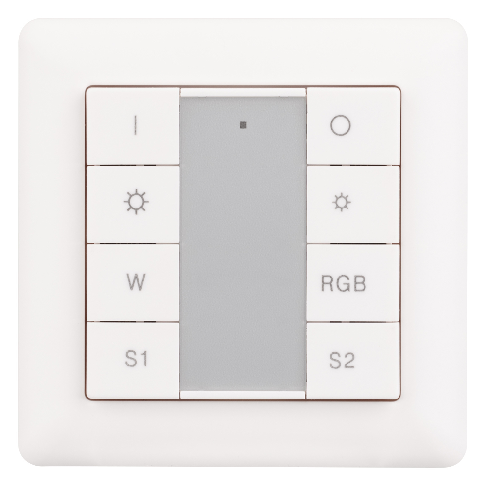 Встраиваемая кнопочная белая пластиковая панель для работы по протоколу DALI. Включение/выключение, диммирование и управления цветом свечения (8 кнопок управления) для мультицветных светодиодных RGBW-лент. 1 зона управления, возможно широковещательное управление. Вызов и сохранение 2-х сцен. Питание по шине DALI. Полнофункциональная работа по DALI DT8: до 64 устройств на шине, при адресации 4 каналов (RGBW) на 1 адрес. Стандартная рамка входит в комплект поставки.