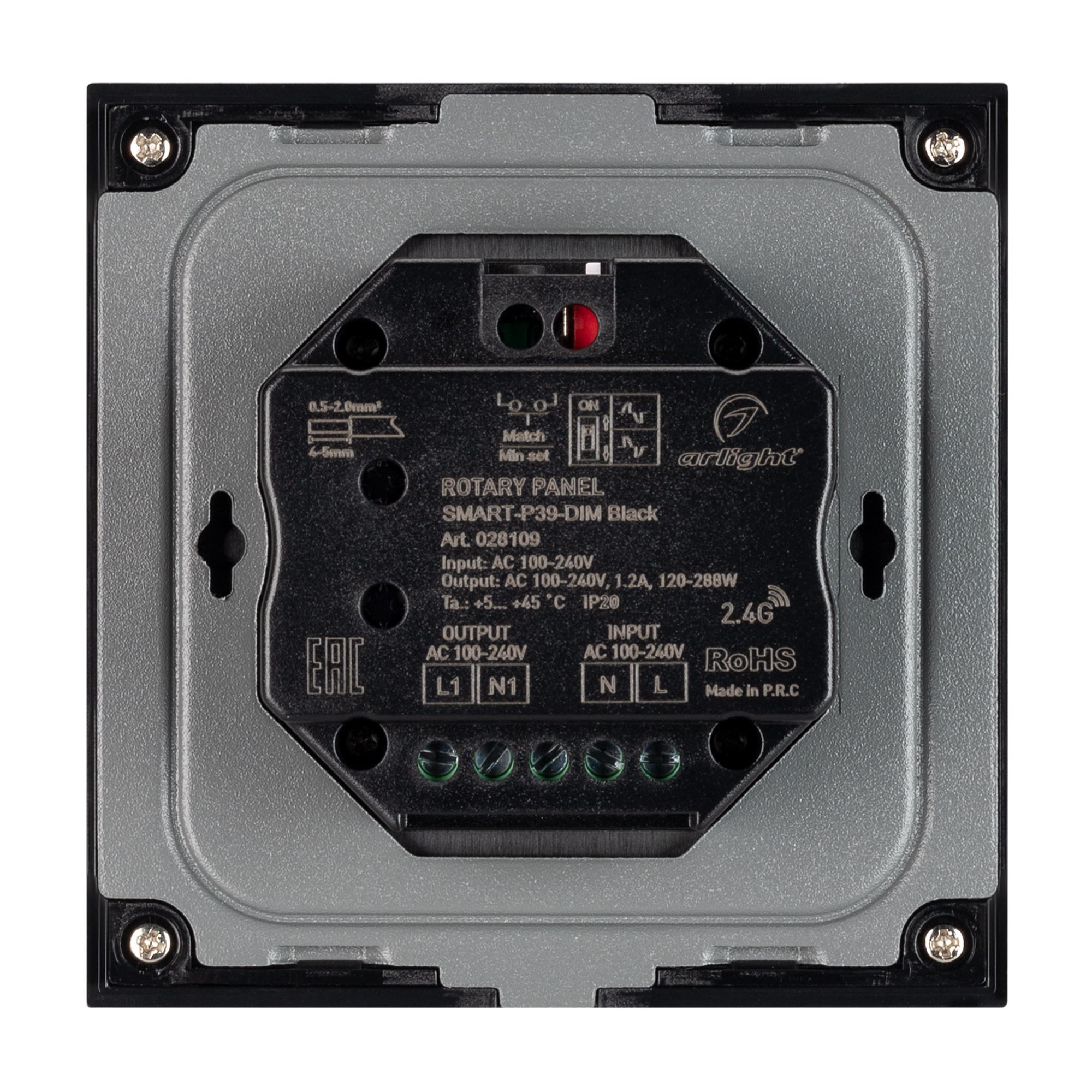 Встраиваемая роторная панель чёрного цвета, предназначенная для управления светодиодными или другими источниками света с напряжением питания 230В. Панель позволяет включать и выключать свет и регулировать его яркость. Удобное и точное управление при помощи вращающегося регулятора. Стильный и современный дизайн, позволяющий устанвливать панель в большинство типов подрозетников и сочетающийся с большинством интерьеров. Панелью можно управлять пультами ДУ и другими панелями серии SMART по радиоканалу 2.4G. Возможна привязка до 10 пультов или панелей управления. Питание 230В, максимальный выходной ток 1.2А, максимальная мощность 288 Вт, максимальная мощность для электронной нагрузки 72 ВА. Габариты устройства 86х86х50 мм. Панель выполнена из стекла, устойчивого к появлению царарин и загрязнения. Устанавливается в стандартную монтажную коробку.