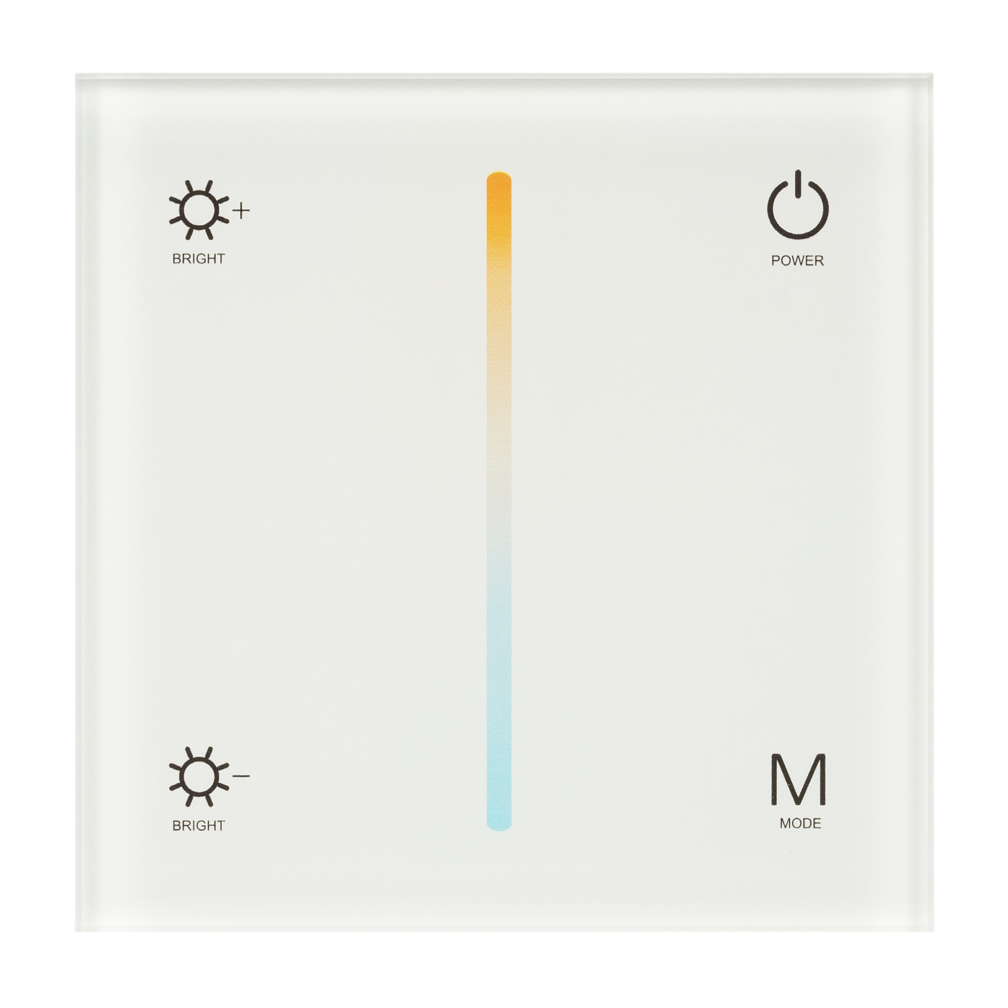 Встраиваемая сенсорная панель белого цвета из стекла, с защитой от мелких царапин. Предназначена для управления мультибелыми (MIX) источниками света (ШИМ) с помощью сенсорной полосы. Основные функции: включение/выключение света, регулировка яркости, изменение цветовой температуры. Изделие можно использовать как диммер с 2 парами параллельных выходов для подключения мультибелых светодиодных лент. Возможно применение как однозонный пульт дистанционного управления диммерами и контроллерами серии SMART. Устройство может управляться пультами дистанционного управления или другими панелями серии SMART. К одной панели возможно привязать неограниченное количество диммеров и контроллеров, совместима с диммерами и контроллерами серии SMART, с управлением по радиоканалу 2.4G. Питание 12-24В, 4 канала управления, максимальный ток 3А на канал, суммарная мощность нагрузки 144-288 Вт. Габариты: 86х86х37 мм, корпус пластика, лицевая часть из стекла. Установка в монтажные коробки стандартного размера.