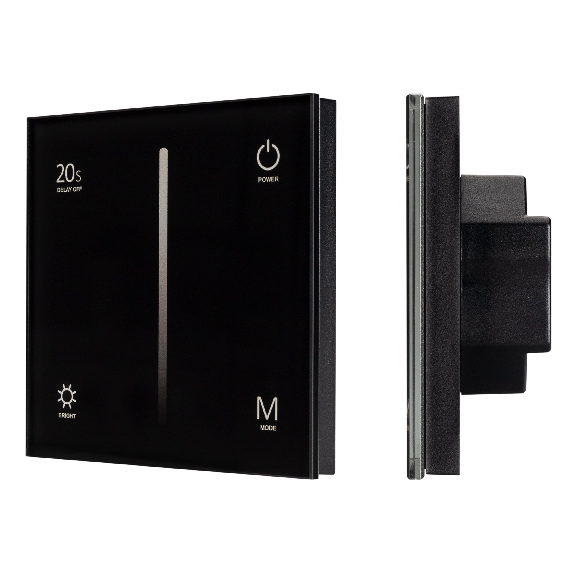 Встраиваемая сенсорная панель чёрного цвета, предназначенная для управления светодиодными или другими источниками света с напряжением питания 230В. Панель позволяет включать и выключать свет и регулировать его яркость. Удобное и точное управление при помощи сенсорной полосы и сенсорных кнопок. Стильный и современный дизайн, позволяющий устанвливать панель в большинство типов подрозетников и сочетающийся с большинством интерьеров. Панелью можно управлять пультами ДУ и другими панелями серии SMART по радиоканалу 2.4G. Возможна привязка до 10 пультов или панелей управления. Питание 230В, максимальный выходной ток 1.2А, максимальная мощность 288 Вт, максимальная мощность для электронной нагрузки 72 ВА. Габариты устройства 86х86х35 мм. Панель выполнена из стекла, устойчивого к появлению царарин и загрязнения. Устанавливается в стандартную монтажную коробку.