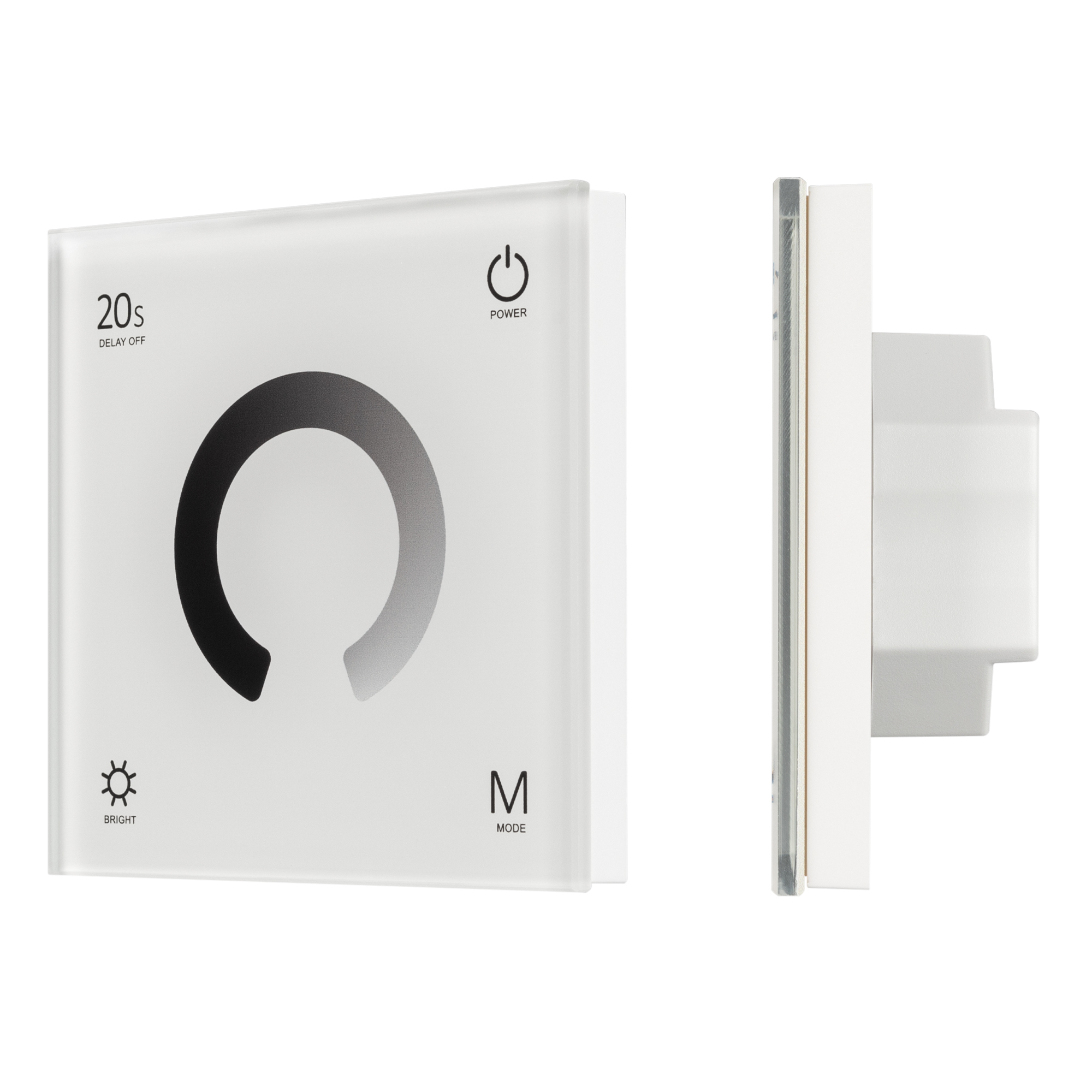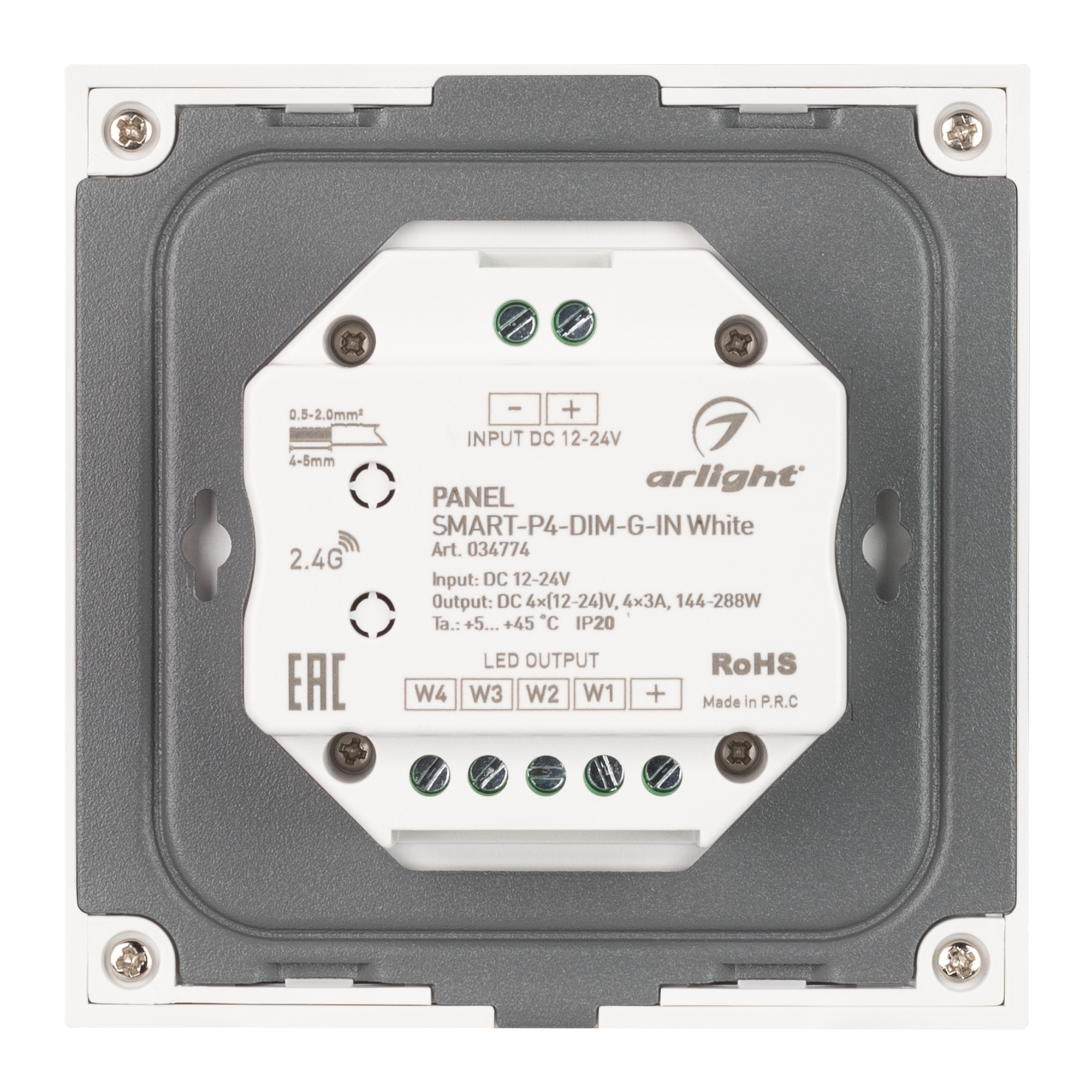Встраиваемая сенсорная стеклянная панель 2.4 ГГц, цвет белый. Для управления одноцветными источниками света (ШИМ). Управление яркостью с помощью сенсорного кольца. Работает в режиме master/slave и может выполнять функцию независимого контроллера. Питание/рабочее напряжение 12-24VDC, 4 параллельных канала по 3А максимальной нагрузки на канал, максимальная суммарная мощность 144-288W. Габариты 86х86х33 мм. Панель совместима с диммерами серии SMART. Возможно управление пультами (см. совместимые товары) или другими панелями.