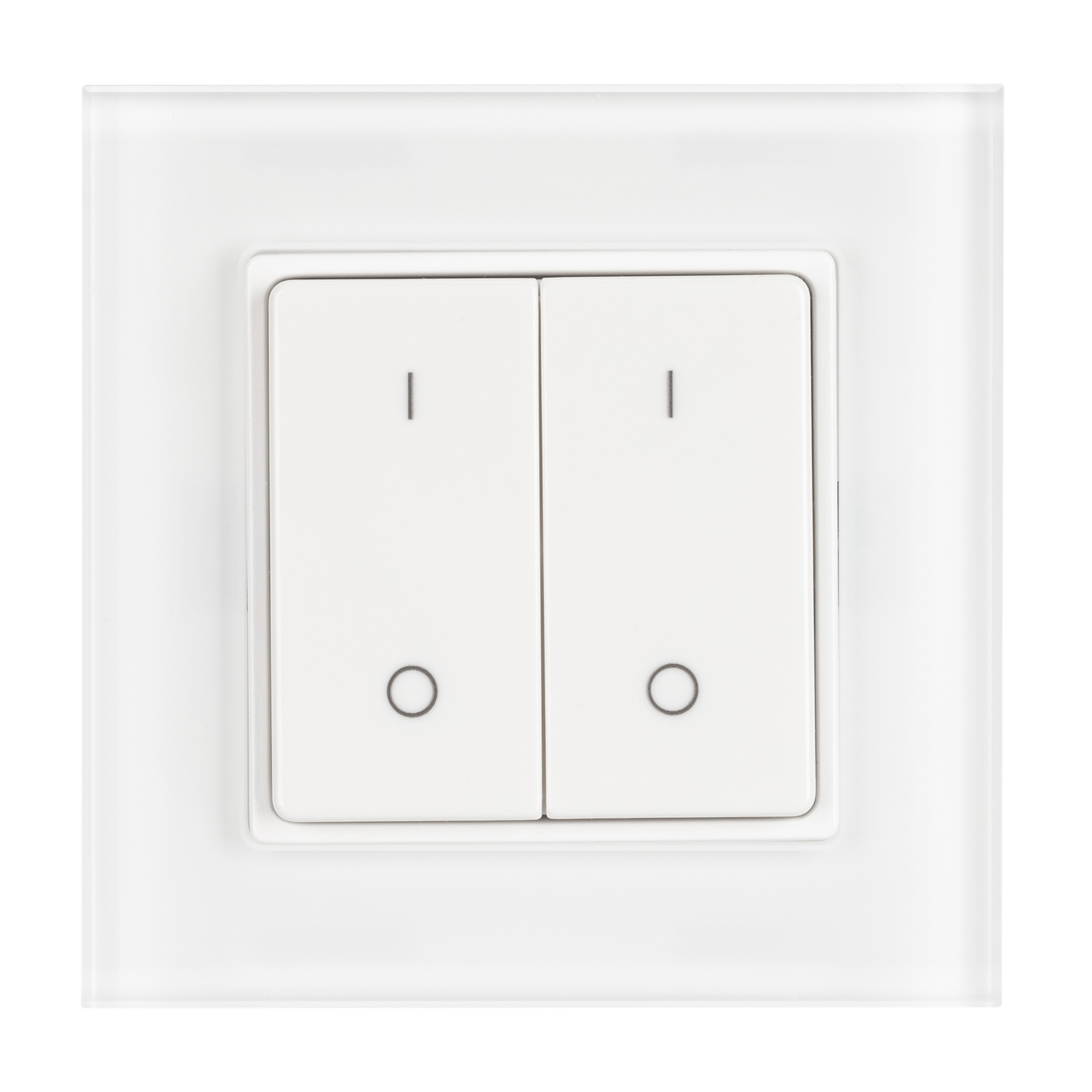 Накладная кнопочная панель 2.4 ГГц, цвет белый. Материал - стекло. Для управления одноцветными источниками света, 2 зоны управления. Питание/рабочее напряжение 3VDC от батарейки CR2032. Габариты 86х86х15 мм. Совместима с диммерами SMART.
