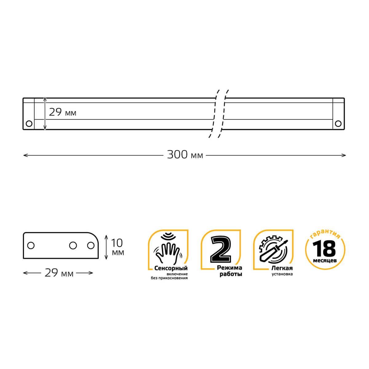 Линейные светодиодные светильники от Gauss- прекрасное решение для подсветки рабочей зоны на кухне, письменного стола, в мастерской или в любом другом пространстве. Сенсорный выключатель позволяет удобно управлять освещением. В зависимости от модели для включения светильника достаточно только приблизиться к нему или произвести легкий взмах рукой или сделать короткое касание к корпусу. Сенсорные светильники Gauss выполнены из алюминия, поэтому обладают легким весом и прочной конструкцией. Светильники различаются по мощности, световому и длиной самого светильника. Особенностью светильников от Gauss является возможность последовательного соединения в линейку нескольких светильников с помощью коннекторов и простая установка – достаточно их приклеить к поверхности с помощью двухстороннего скотча или прикрепить его с помощью металлических скоб. Набор установочных креплений для двух вариантов монтажа входят в комплектацию данного изделия.