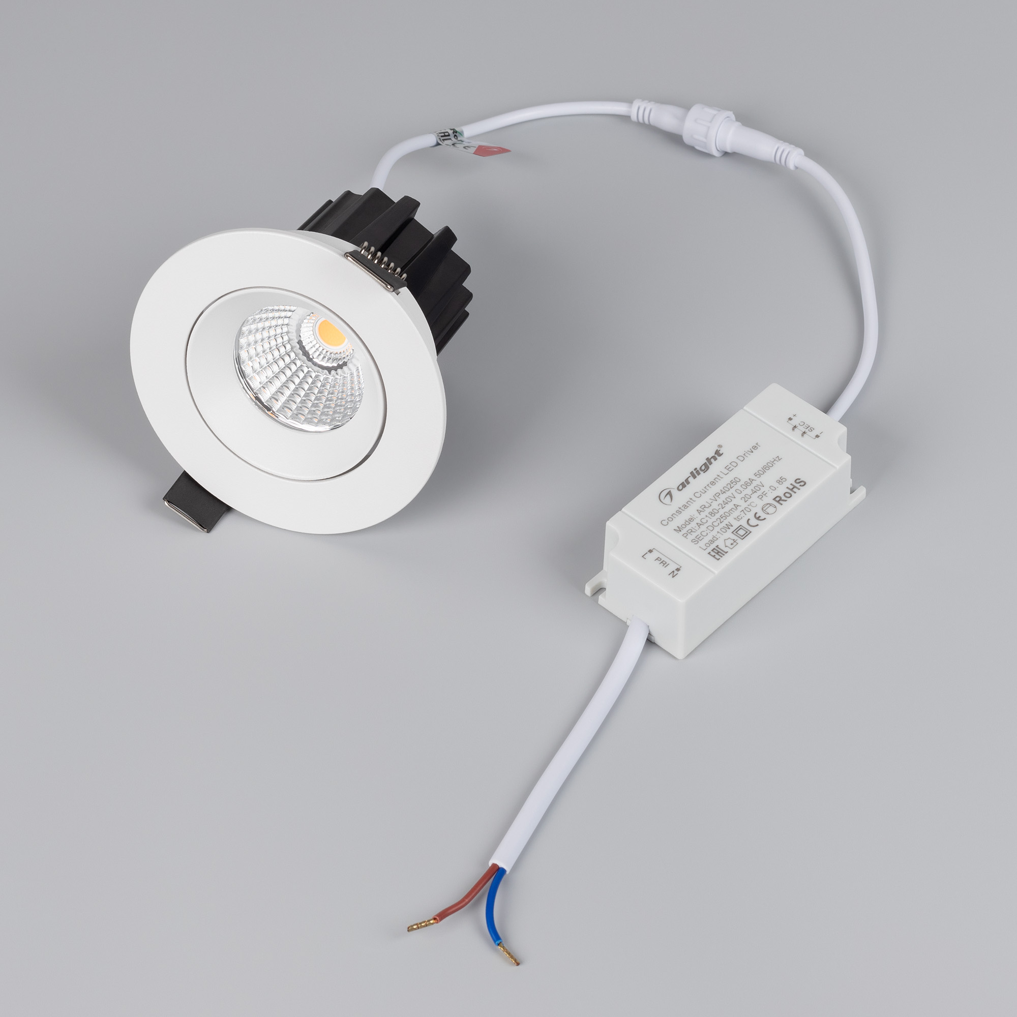 Встраиваемый поворотный светильник даунлайт. Мощность 10 Вт, св. поток 910 лм, 90 лм/Вт, дневной 4000 K, CRI>90, угол 60°, напряжение питания 230 В. Белый круглый корпус из алюминия, экран PMMA, степень защиты IP54. Размер: диаметр 94 мм, высота 75 мм. Монтаж встраиваемый, установочное отверстие: диаметр 77 мм. Драйвер IP54, 20-40 В, 250 мА, пульсация <1%.