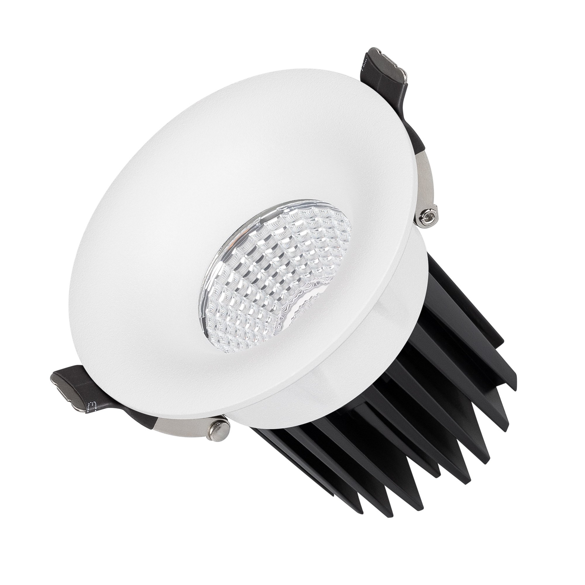 Встраиваемый светильник даунлайт. Мощность 10 Вт, св. поток 880 лм, 88 лм/Вт, дневной 4000 K, CRI>90, угол 60°, напряжение питания 230 В. Белый круглый корпус из алюминия, экран PMMA, степень защиты IP54. Размер: диаметр 86 мм, высота 80 мм. Монтаж встраиваемый, установочное отверстие: диаметр 75 мм. Драйвер IP54, 20-40 В, 250 мА, пульсация <1%.