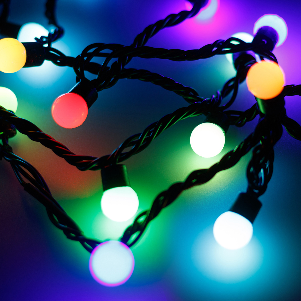 Светодиодные шарики Classic. Размер 10000 мм. Цвет светодиодов RGBY, эффект динамики (автоматическая быстрая смена цвета свечения). 100 шариков со светодиодом внутри размером 17.5 мм с мягким световым рисунком (выпуклая молочно-белая линза). Провод чёрный, ПВХ. Питание 230 В, Мощность 7 Вт, защита IP65, применение в помещении и на улице под навесом. Аксессуары для подключения приобретаются отдельно.