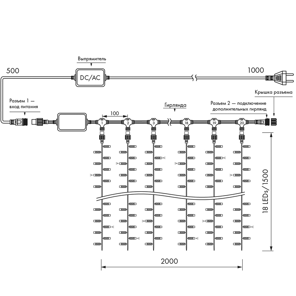 Светодиодный Занавес Classic. Размер 2000x1500 мм (длина 2000 мм, высота 1500 мм). 18 ниспадающих нитей длиной 1500 мм. 360 светодиодов размером 7 мм. Основной цвет свечения БЕЛЫЙ (6000 К), эффект мерцания редких точек БЕЛЫЙ (6000К) с резким световым рисунком (прозрачная вогнутая линза), соотношение светодиодов: 300 белых постоянного свечения / 60 белых с мерцанием. Эффект частого мерцания. Провод прозрачный, ПВХ. Питание 230 В, Мощность 60 Вт, защита IP65, применение в помещении и на улице под навесом. Аксессуар для подключения и выбора режима свечения в комплекте.