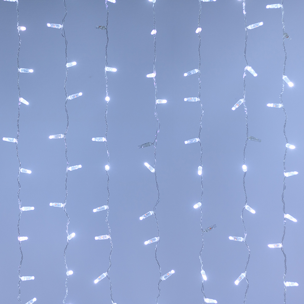 Светодиодный Занавес Classic. Размер 2000x3000 мм (длина 2000 мм, высота 3000 мм). 20 ниспадающих нитей длиной 3000 мм. 760 светодиодов размером 7 мм. Основной цвет свечения БЕЛЫЙ (6000 К), эффект мерцания редких точек БЕЛЫЙ (6000К) с резким световым рисунком (прозрачная вогнутая линза), соотношение светодиодов: 634 белых постоянного свечения / 126 белых с мерцанием. Эффект частого мерцания. Провод прозрачный, ПВХ. Питание 230 В, Мощность 70 Вт, защита IP65, применение в помещении и на улице под навесом. Аксессуар для подключения и выбора режима свечения в комплекте.