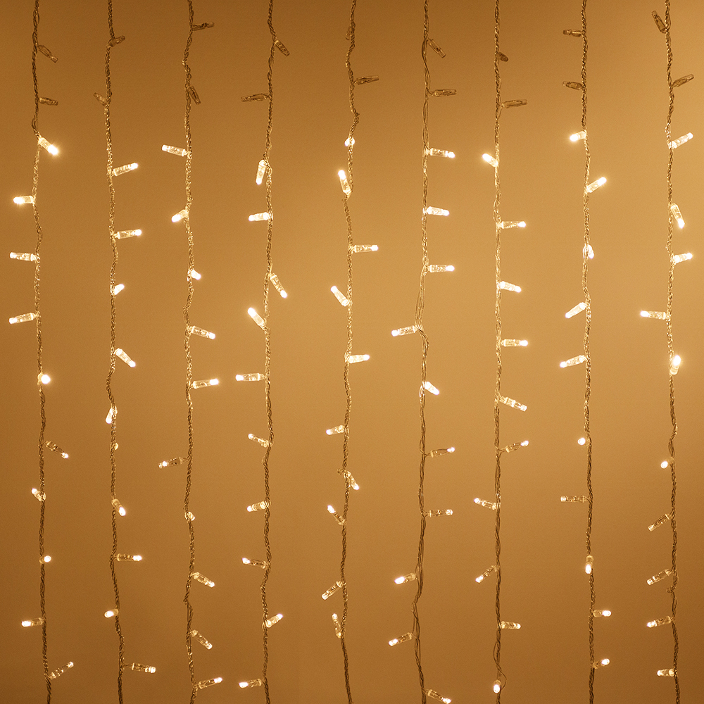Светодиодный занавес Classic. Размер 2000x9000 мм (длина 2000 мм, высота 9000 мм). 20 ниспадающих нитей длиной 9000 мм. Цвет светодиодов ТЕПЛЫЙ БЕЛЫЙ (3000 К), динамический эффект "водопад". 2200 светодиодов размером 7 мм с резким световым рисунком (прозрачная вогнутая линза). Провод прозрачный, ПВХ. Питание 230 В, Мощность 180 Вт, защита IP65, применение в помещении и на улице под навесом. Аксессуары для подключения в комплекте.