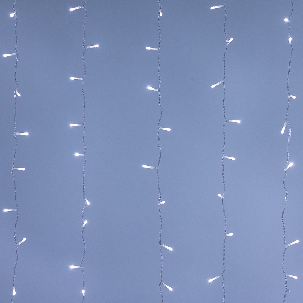 Светодиодный Занавес Home. Размер 1500x1500 мм (длина 1500 мм, высота 1500 мм). 8 ниспадающих нитей длиной 1500 мм. 144 светодиода размером 5 мм. Цвет свечения БЕЛЫЙ (6000 К), постоянное свечение и 8 динамических эффектов с резким световым рисунком (прозрачная вогнутая линза). Провод прозрачный, ПВХ. Питание 230 В, Мощность 6 Вт, защита IP20, применение в помещении. Аксессуар для подключения и выбора режима свечения в комплекте.