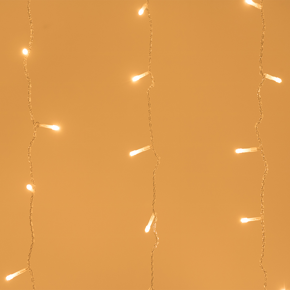 Светодиодный Занавес Home. Размер 2000x2500 мм (длина 2000 мм, высота 2500 мм). 12 ниспадающих нитей длиной 2500 мм. 300 светодиодов размером 5 мм. Цвет свечения ТЕПЛЫЙ БЕЛЫЙ (3000 К), постоянное свечение и 8 динамических эффектов с резким световым рисунком (прозрачная вогнутая линза). Провод прозрачный, ПВХ. Питание 230 В, Мощность 12 Вт, защита IP20, применение в помещении. Аксессуар для подключения и выбора режима свечения в комплекте.