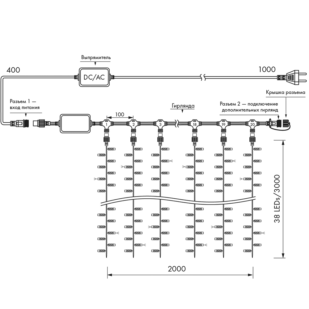 Светодиодный Занавес Pro. Размер 2000x3000 мм (длина 2000 мм, высота 3000 мм). 20 ниспадающих нитей длиной 3000 мм. 760 светодиодов размером 7 мм. Основной цвет свечения ТЕПЛЫЙ БЕЛЫЙ (3000 К), эффект мерцания редких точек БЕЛЫЙ (6000К) с резким световым рисунком (прозрачная вогнутая линза), соотношение светодиодов: 634 теплых постоянного свечения / 126 белых с мерцанием. Эффект частого мерцания. Провод черный, каучук. Питание 230 В, Мощность 70 Вт, защита IP65, применение в помещении и на улице под навесом. Аксессуар для подключения и выбора режима свечения в комплекте.