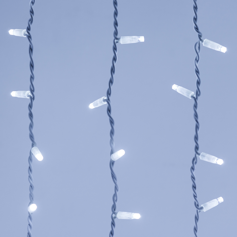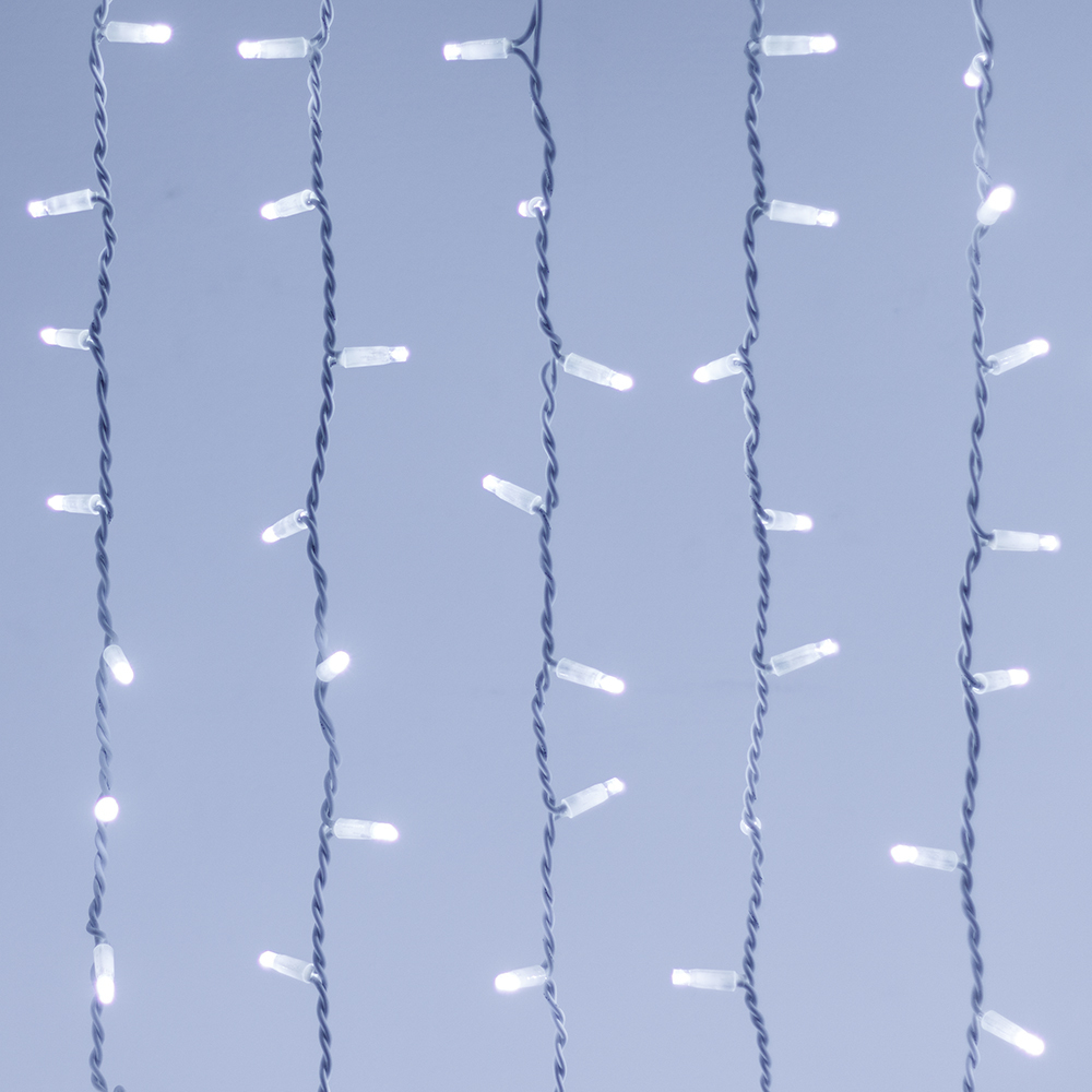Светодиодный Занавес Pro. Размер 2000x3000 мм (длина 2000 мм, высота 3000 мм). 20 ниспадающих нитей длиной 3000 мм. 760 светодиодов размером 7 мм. Цвет свечения БЕЛЫЙ (6000 К), постоянное свечение и 8 динамических эффектов с резким световым рисунком (прозрачная вогнутая линза). Провод белый, каучук. Питание 230 В, Мощность 70 Вт, защита IP65, применение в помещении и на улице под навесом. Аксессуар для подключения и выбора режима свечения в комплекте.