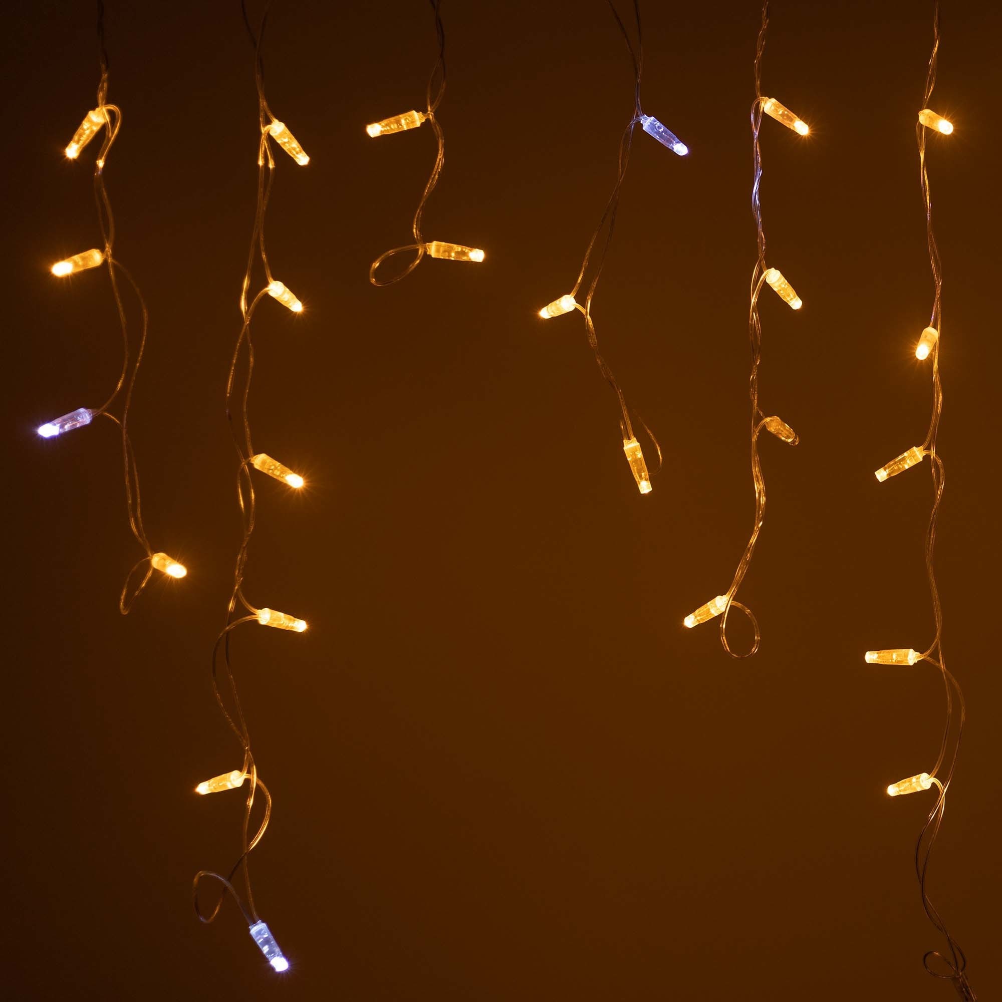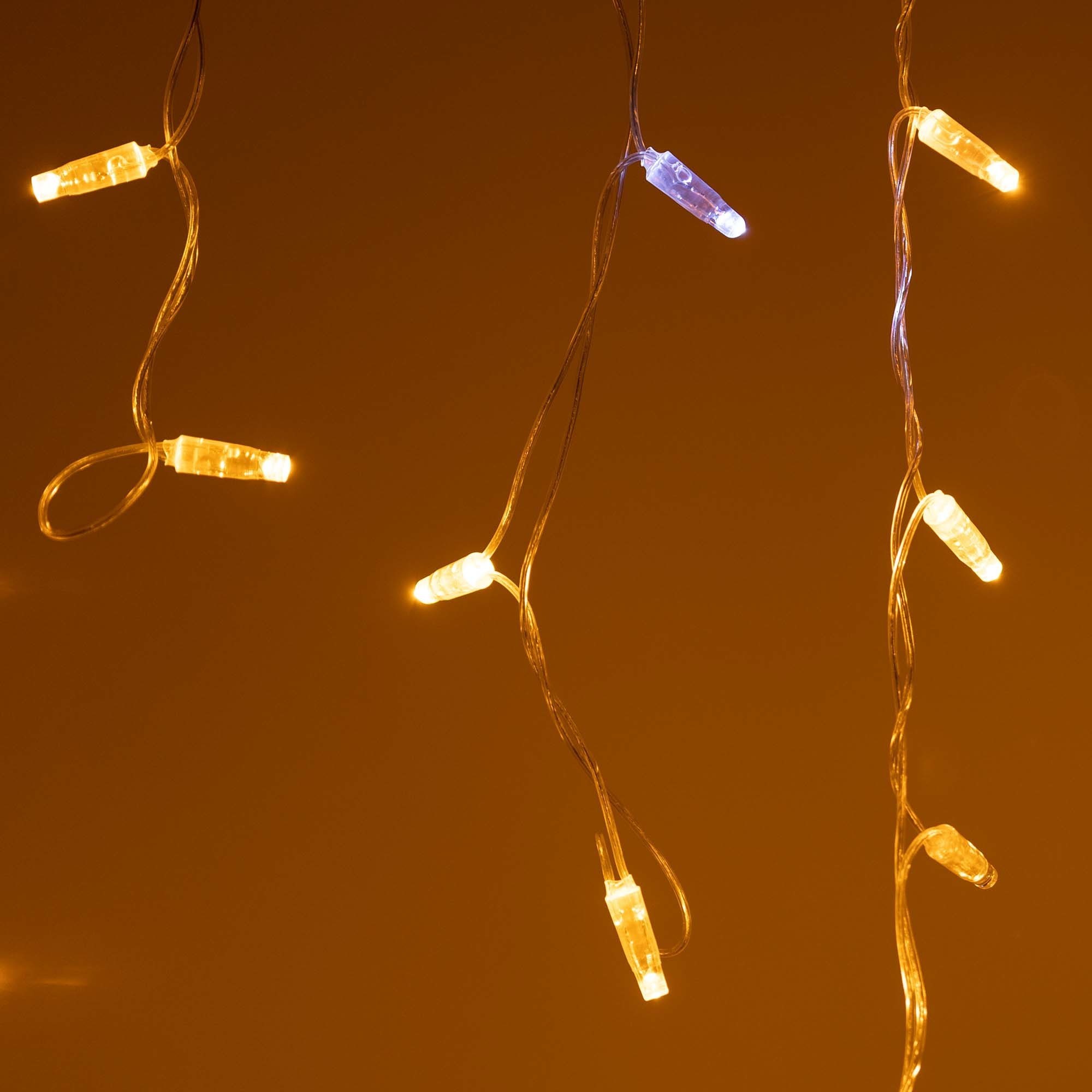 Светодиодная бахрома Classic. Размер 2400 мм (длина 2400 мм, по длине 24 нити высотой 200/600 мм). Количество светодиодов 88 шт размером 7 мм. Основной цвет свечения ЖЕЛТЫЙ, эффект мерцания редких точек (БЕЛЫЙ 6000К) с резким световым рисунком (прозрачная вогнутая линза), соотношение светодиодов: 66 желтых постоянного свечения / 12 белых с мерцанием. Эффект частого мерцания. Провод прозрачный, ПВХ. Питание 230 В, Мощность 6 Вт, защита IP65, применение на улице под навесом. Аксессуары для подключения приобретаются отдельно.
