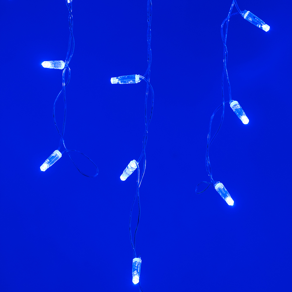 Светодиодная бахрома Classic. Размер 2400x600 мм (длина 2400 мм, по длине 24 нити высотой 200/600 мм). Количество светодиодов 88 шт размером 7 мм. Цвет свечения СИНИЙ, эффект постоянного свечения с резким световым рисунком (прозрачная вогнутая линза). Провод прозрачный, ПВХ. Питание 230 В, Мощность 6 Вт, защита IP65, применение на улице под навесом. Аксессуары для подключения приобретаются отдельно.
