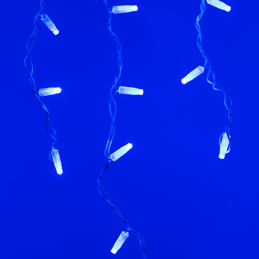 Светодиодная бахрома Classic. Размер 2400x600 мм (длина 2400 мм, по длине 24 нити высотой 200/600 мм). Количество светодиодов 88 шт размером 7 мм. Цвет свечения СИНИЙ, эффект постоянного свечения с резким световым рисунком (прозрачная вогнутая линза). Провод белый, ПВХ. Питание 230 В, Мощность 6 Вт, защита IP65, применение на улице под навесом. Аксессуары для подключения приобретаются отдельно.