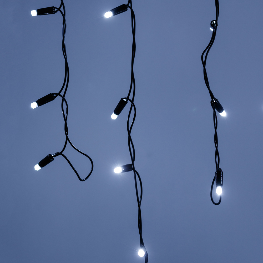 Светодиодная бахрома Pro. Размер 4000x600 мм (длина 4000 мм, по длине 32 нити высотой 200/600 мм). Количество светодиодов 128 шт размером 7 мм. Цвет свечения БЕЛЫЙ (6000 К), эффект постоянного свечения с мягким световым рисунком (выпуклая молочно-белая линза). Провод черный, каучук. Питание 230 В, Мощность 8 Вт, защита IP65, применение на улице под навесом. Аксессуары для подключения приобретаются отдельно.