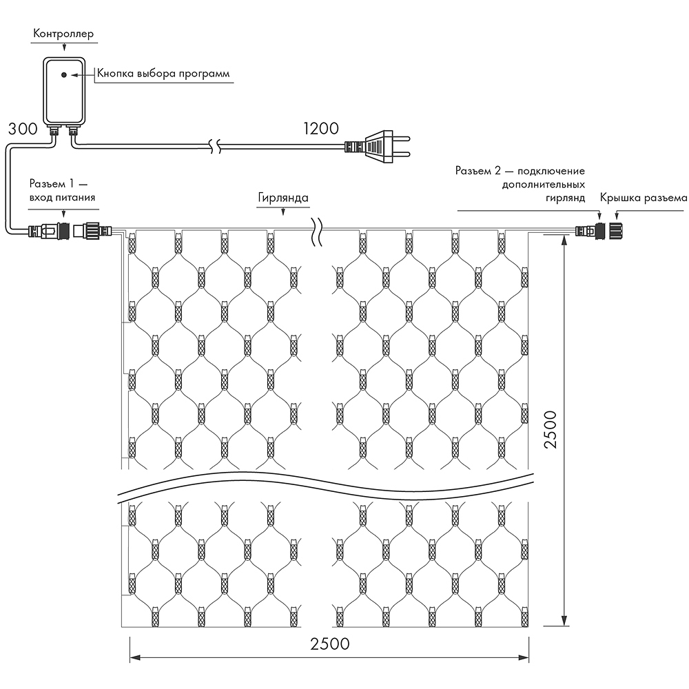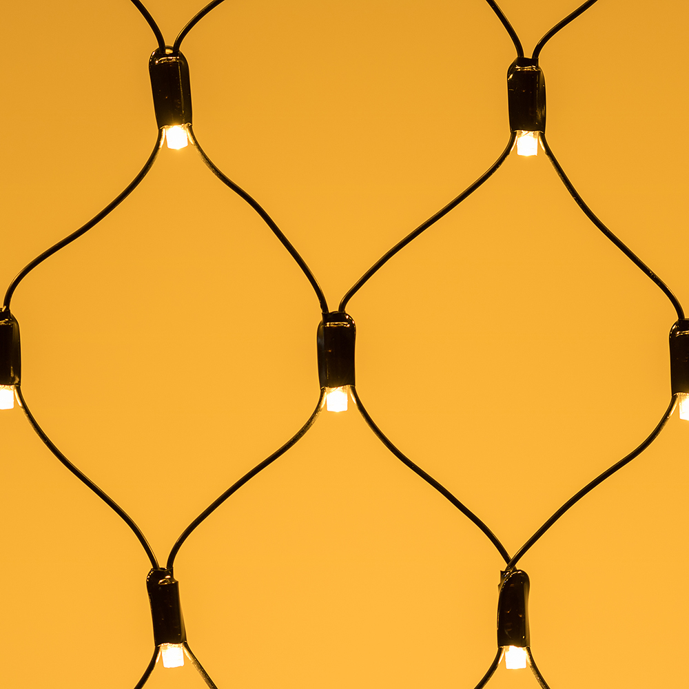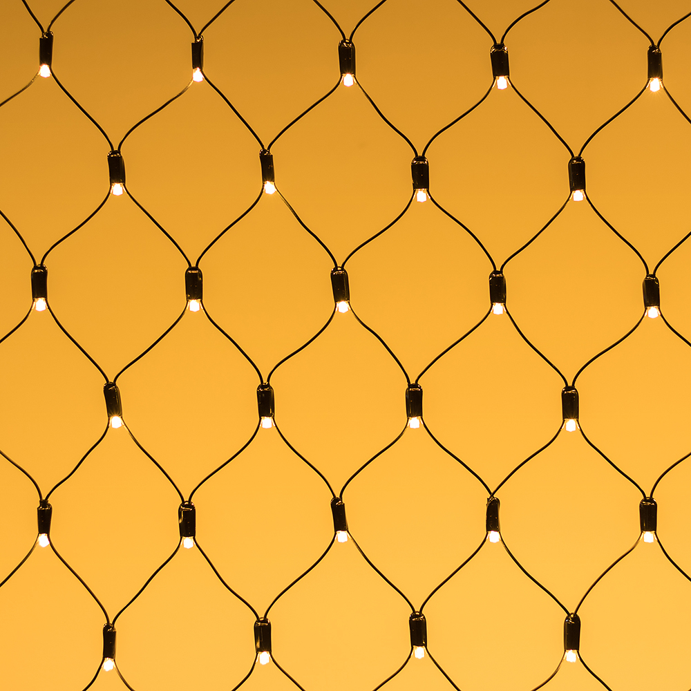 Светодиодная сеть Classic. 2500x2500 (длина 2500 мм, высота 2500 мм). Цвет свечения ТЕПЛЫЙ БЕЛЫЙ (3000 К). 432 светодиода размером 7 мм со статическим и 8 динамическими эффектами свечения с резким световым рисунком (прозрачная вогнутая линза). Провод черный, ПВХ. Питание 230 В, Мощность 26 Вт,защита IP65, применение в помещении и на улице под навесом Аксессуары для подключения и выбора режима свечения в комплекте.