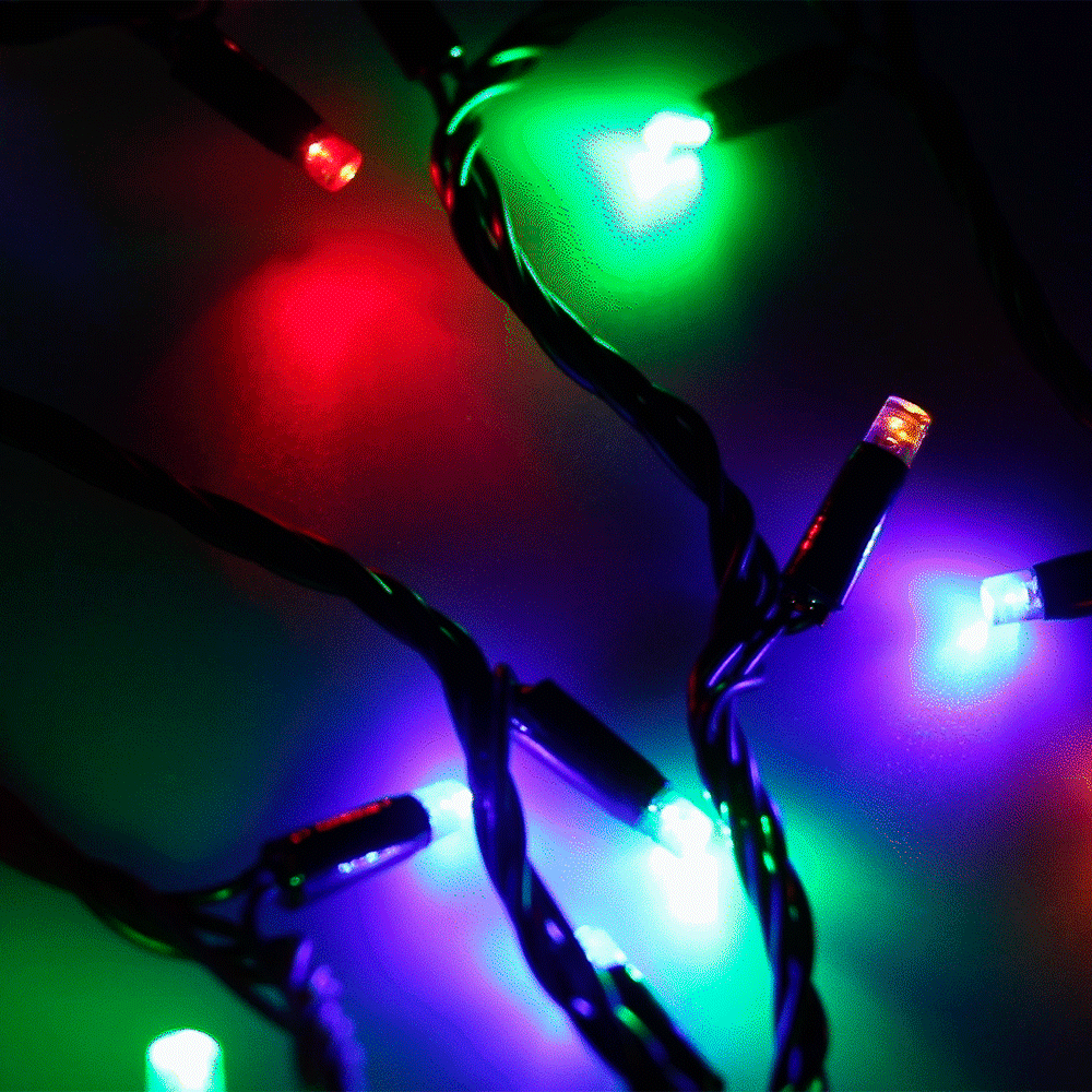 Светодиодная нить Classic. Размер 10000 мм. Цвет свечения RGBY, 100 светодиодов размером 7 мм с динамическими и статическими эффектами свечения с резким световым рисунком (прозрачная вогнутая линза). Смена эффектов и управление осуществляется с помощью контроллера с пультом. Провод черный, ПВХ. Питание 230 В, Мощность 7 Вт, защита IP65, применение в помещении и на улице под навесом. Аксессуары для подключения и управления приобретаются отдельно.