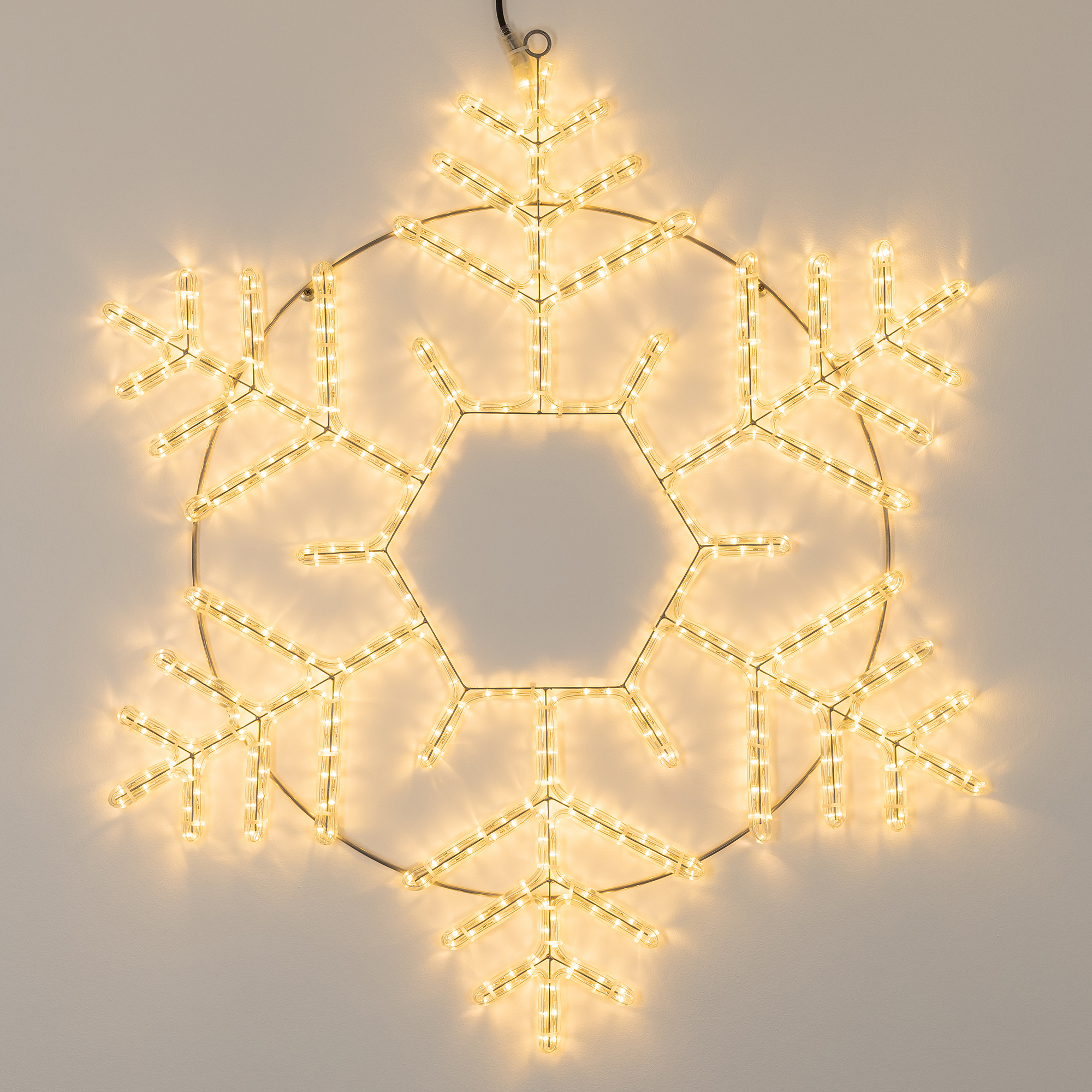 Светодиодная фигура СНЕЖИНКА. Размер 1000x900 мм. Цвет светодиодов ТЕПЛЫЙ БЕЛЫЙ (3000 К), постоянное свечение. 504 светодиодов. Напряжение питания 230 В, потребляемая мощность 31 Вт, степень пылевлагозащиты IP65. Фигура укомплектована проводом питания для подключения к сети 230 В (без вилки питания).