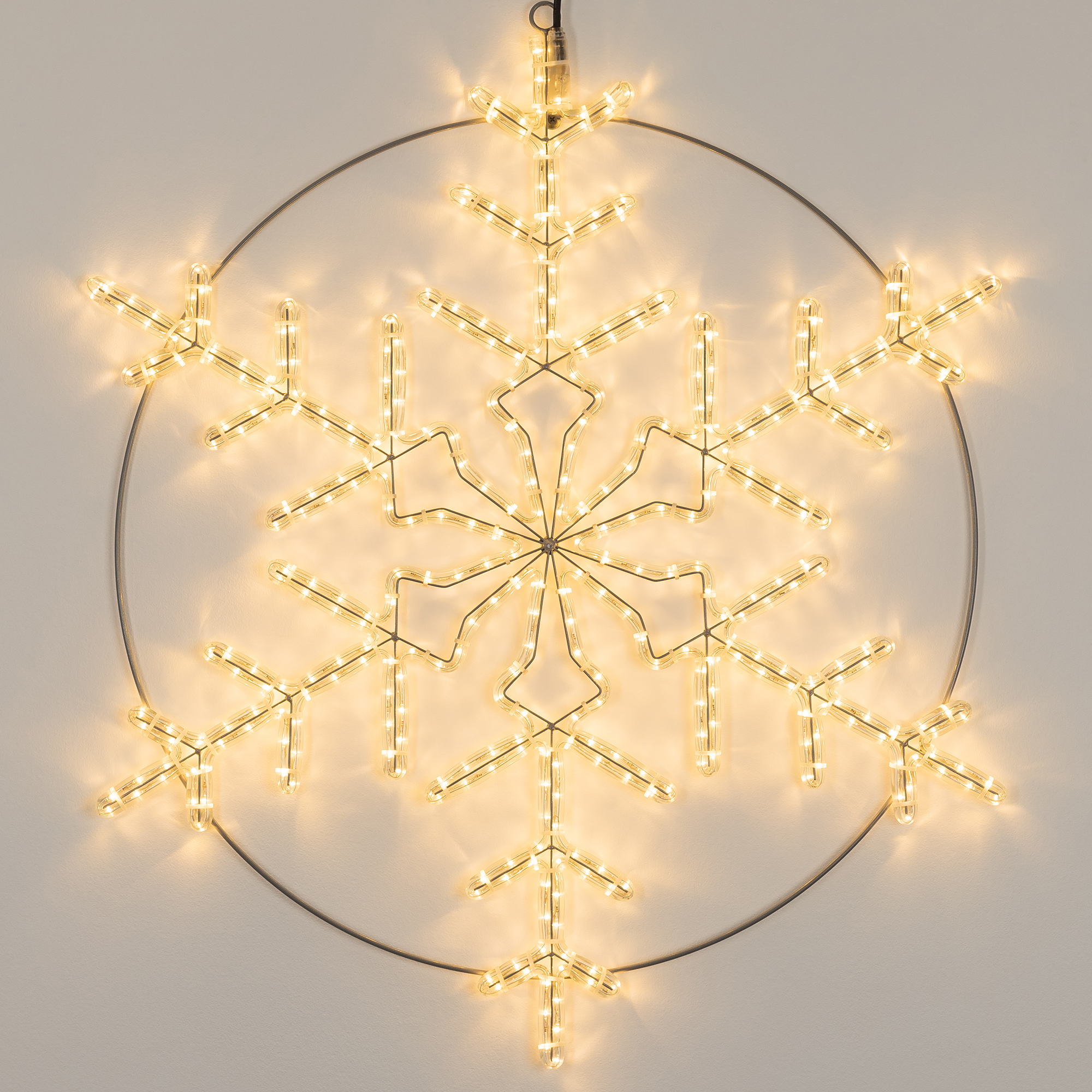 Светодиодная фигура СНЕЖИНКА. Размер 920x920 мм. Цвет светодиодов ТЕПЛЫЙ БЕЛЫЙ (3000 К), постоянное свечение. 432 светодиода. Напряжение питания 230 В, потребляемая мощность 30 Вт, степень пылевлагозащиты IP65. Фигура укомплектована проводом питания для подключения к сети 230 В (без вилки питания).