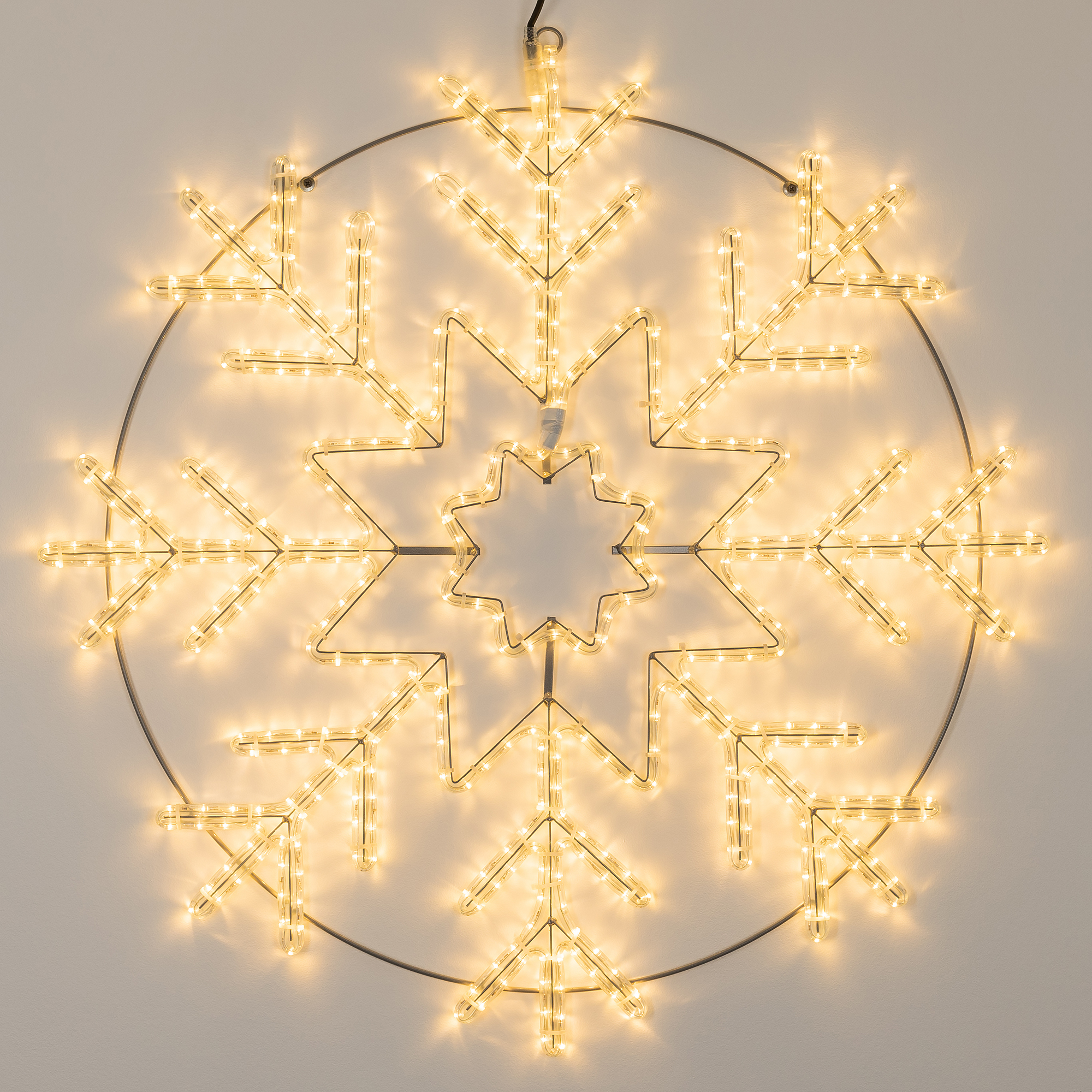 Светодиодная фигура СНЕЖИНКА. Размер 950x950 мм. Цвет светодиодов ТЕПЛЫЙ БЕЛЫЙ (3000 К), постоянное свечение. 540 светодиодов. Напряжение питания 230 В, потребляемая мощность 33 Вт, степень пылевлагозащиты IP65. Фигура укомплектована проводом питания для подключения к сети 230 В (без вилки питания).
