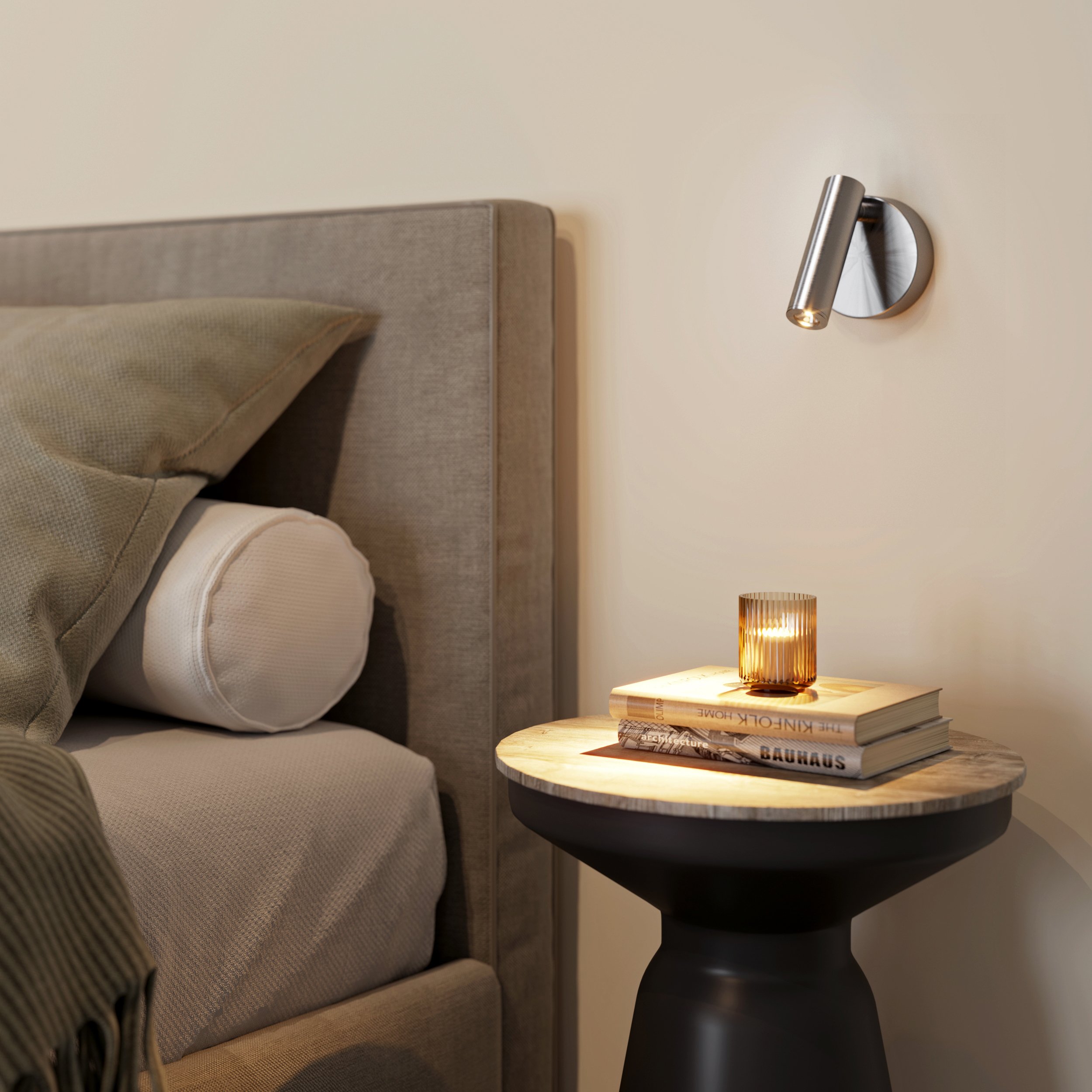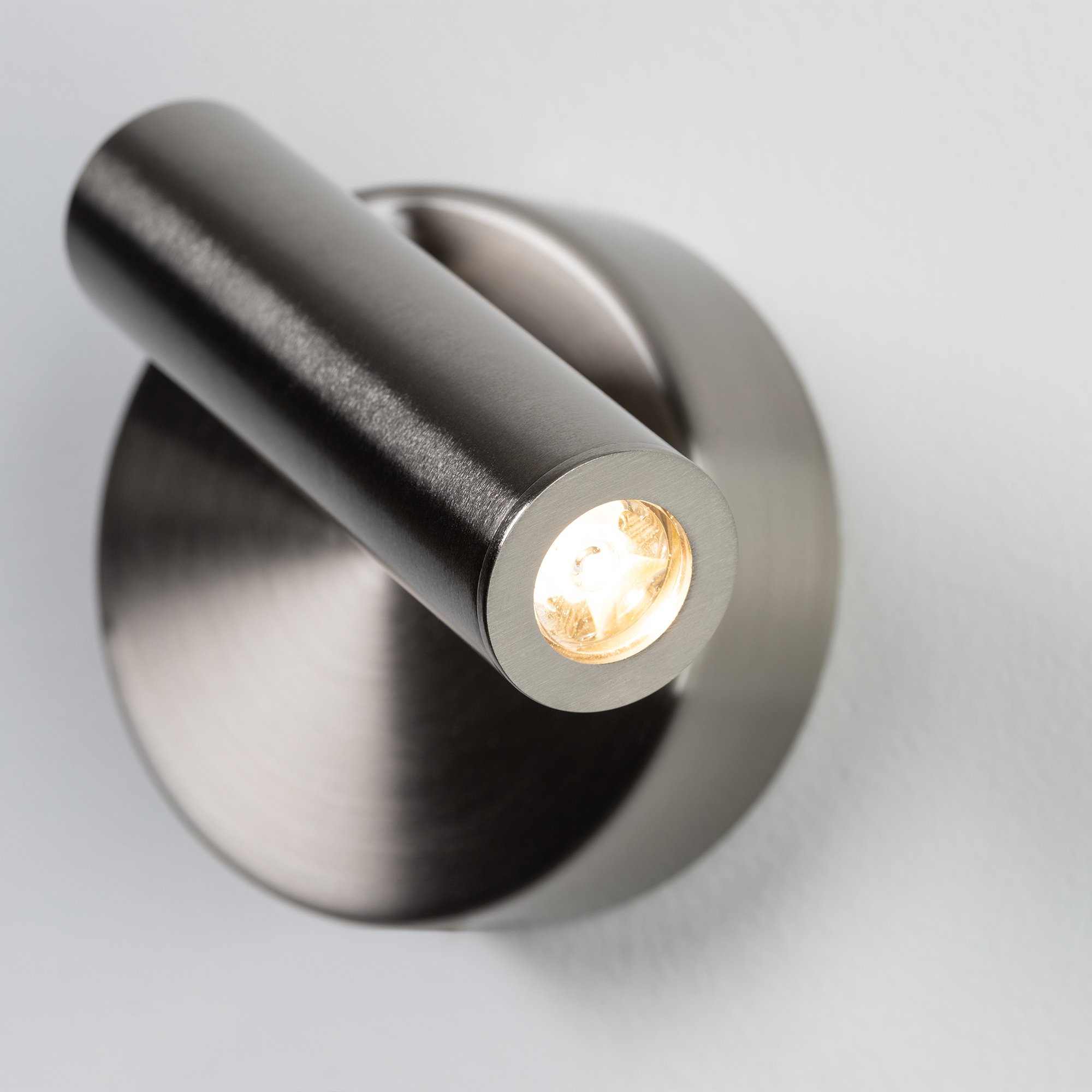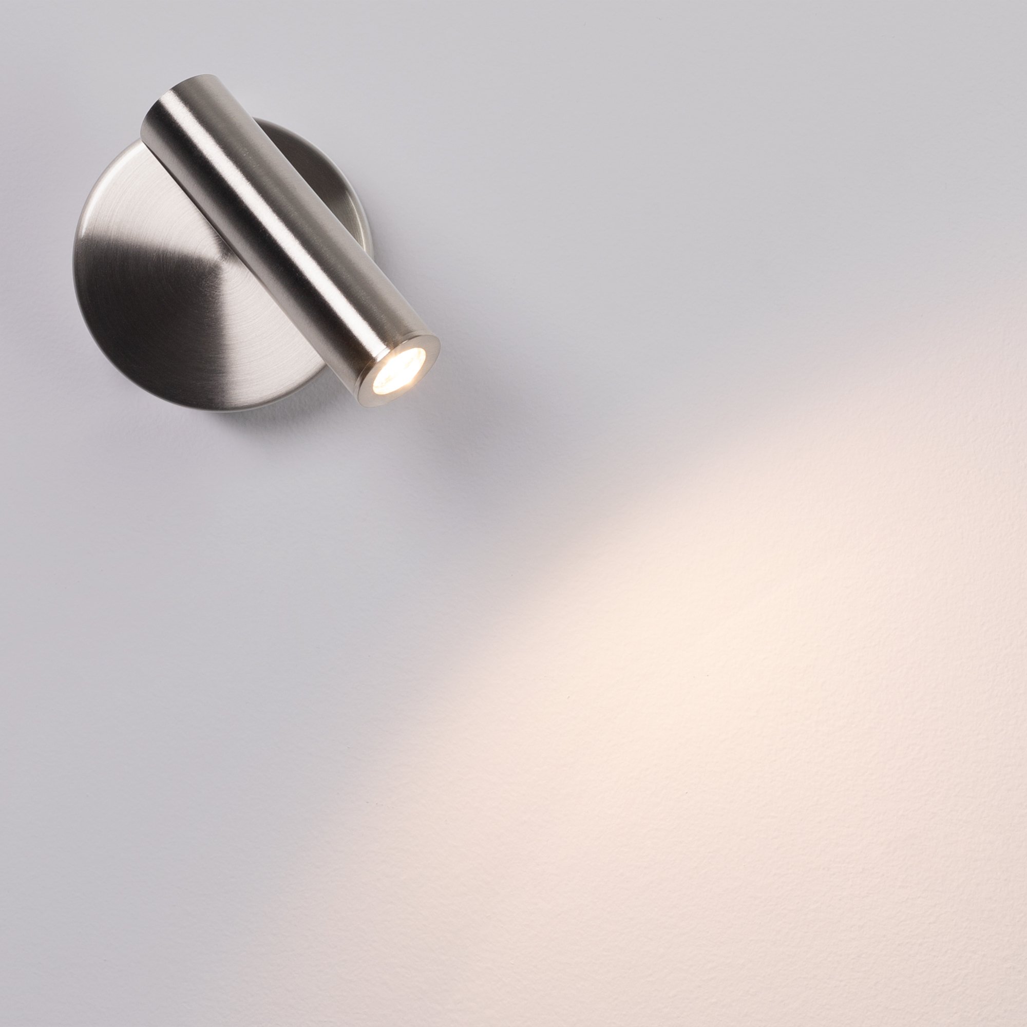 Настенный накладной светильник-бра SP-BED-NB-R90-3W Warm3000 (NI, 20 deg, 230V) мощностью 3 Вт. Индекс цветопередачи CRI>80, теплый белый цвет свечения (3000 K) и световой поток 200 лм. Узкий угол излучения света 20° для расстановки световых акцентов. Световой модуль можно регулировать и поворачивать вокруг своей оси на 350°. Предназначен для создания индивидуальных зон освещенности в жилых, торговых помещениях, гостиницах. Встроенный драйвер для быстрого и безопасного подключения к сети 230 В.