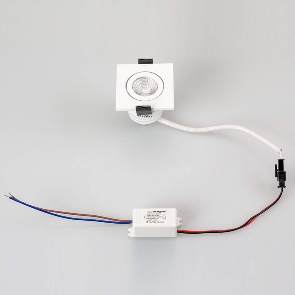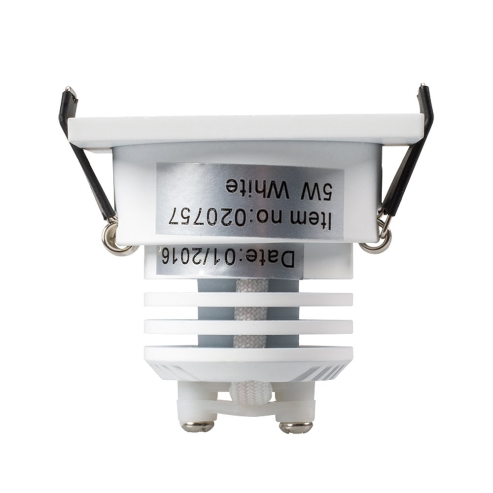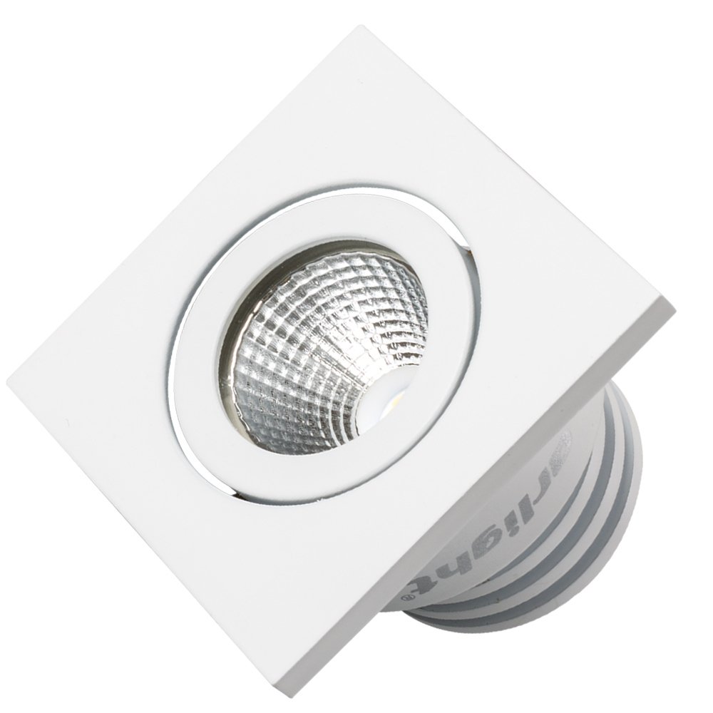 Врезной квадратный мебельный светильник 5Вт, корпус белый алюминий. Цвет ДНЕВНОЙ БЕЛЫЙ 4000K. Светодиод 1х5W Bridgelux. CRI>80, Св.поток 350-400лм, наклоняемая ось, угол 25°. Питание 180-240VAC, 5Вт, 400mA 11-13V, драйвер в комплекте. Размеры 50x50x50 мм, врезное отверстие d42 мм.