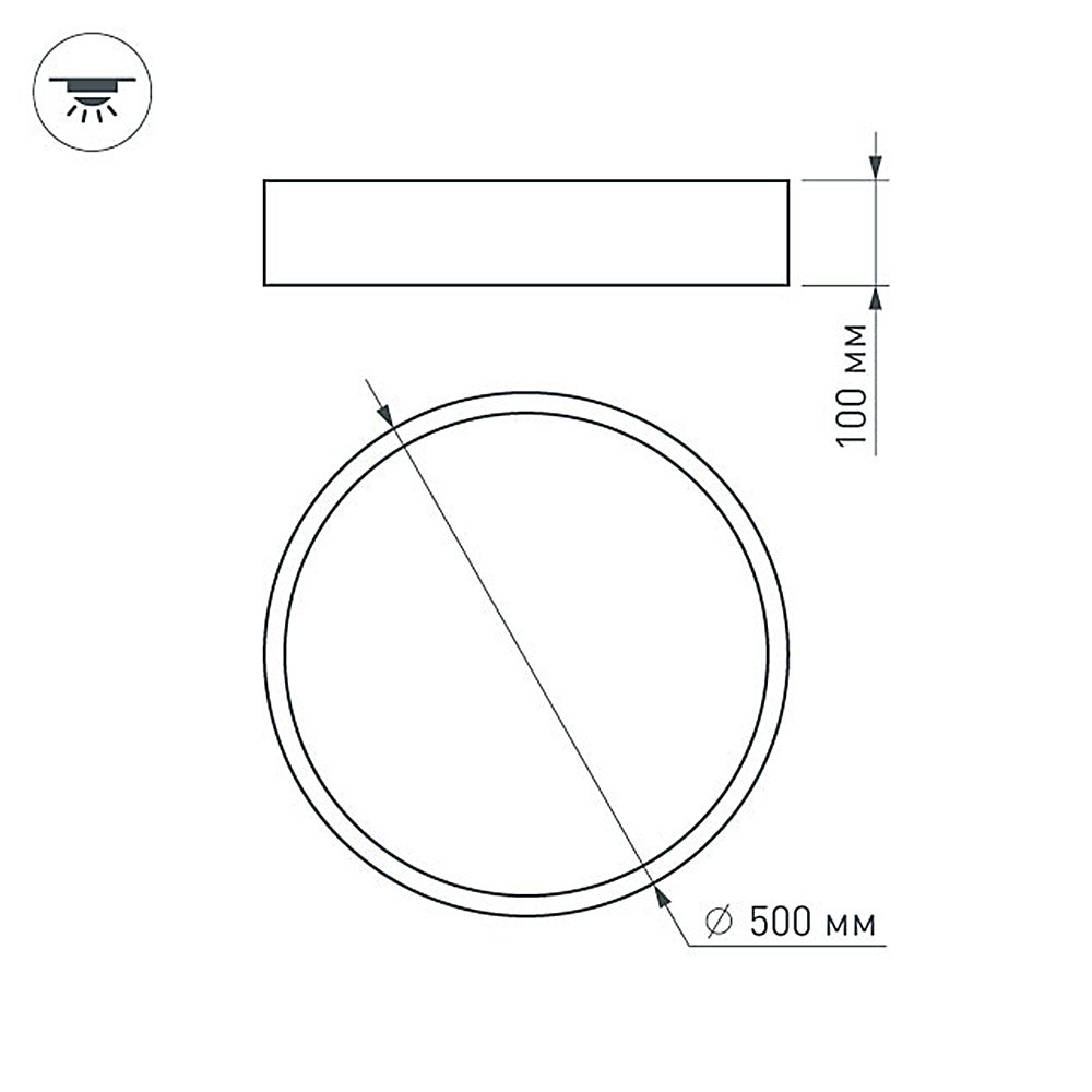 Накладной интерьерный светильник. Мощность 35 Вт, св. поток 3150 лм, 90 лм/Вт, дневной 4000 K, CRI>80, угол 120°, напряжение питания 230 В. Белый круглый корпус из алюминия, степень защиты IP20. Размер: диаметр 500 мм, высота 100 мм. Монтаж накладной. Драйвер 30-42 В, 950 мА, пульсация <5%.