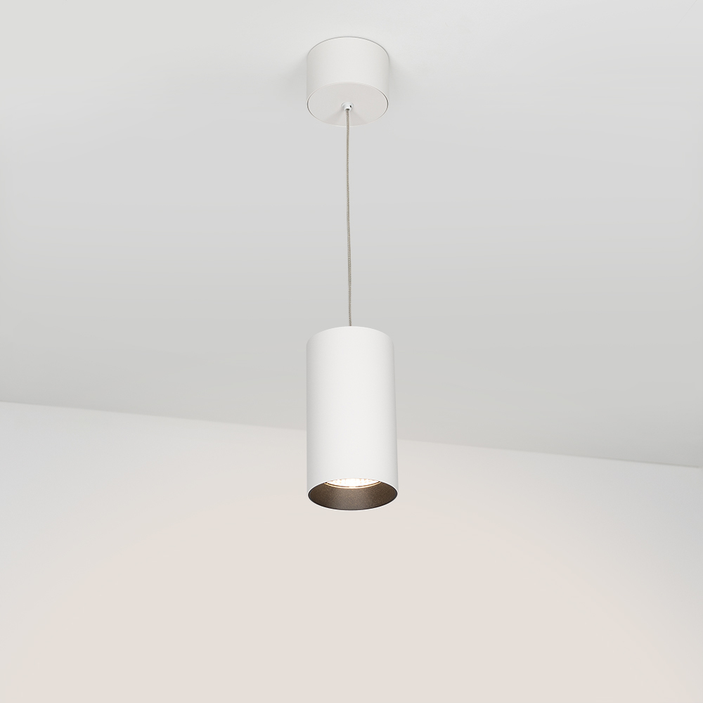 Подвесной светильник 15Вт, белый круглый корпус, черная вставка, металл. Цвет ТЕПЛЫЙ БЕЛЫЙ 3000K, св.поток 1100лм, CRI(Ra)>80, угол 40°. Размер Ø85x155мм. Встроенный драйвер PRI:220-240VAC, SEC:DC 350mA 23-36V 15Вт.