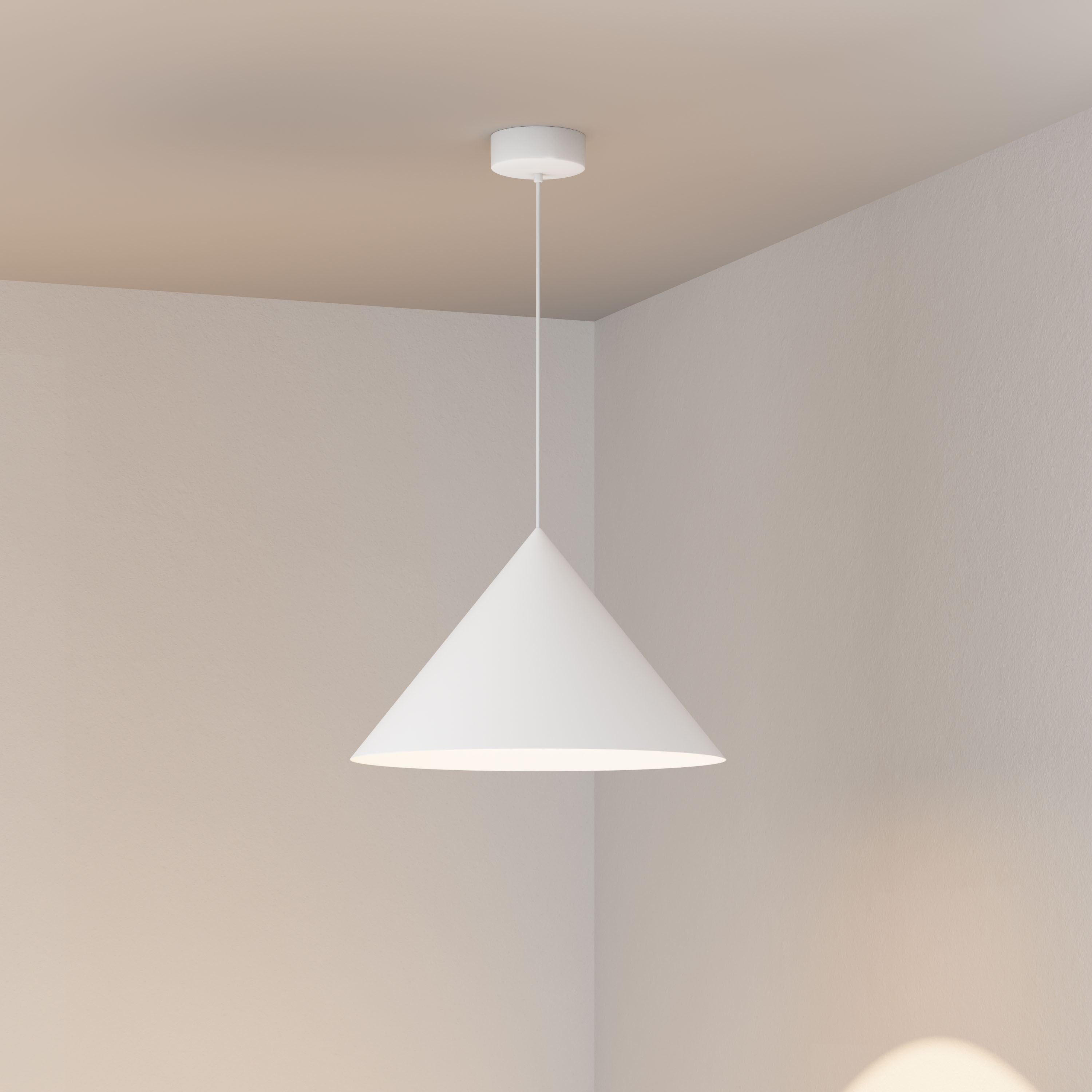 Подвесной светильник. Мощность 14 Вт, св. поток 1200 лм, 74 лм/Вт, тёплый 3000 K, CRI>92, угол 36°, напряжение питания 230 В. Белый корпус из алюминия в форме конуса с белой внутренней поверхностью, линза-рассеиватель из PMMA, степень защиты IP20. Размер: диаметр 550 мм, высота 340 мм. Монтаж подвесной, длина подвеса 2000 мм, регулируемая. В комплекте 2 вида чаш. Габариты встраиваемой чаши: Ø 80x23 мм. Габариты накладной чаши Ø140x55 мм. Драйвер 27-42 В, 350 мА, пульсация <1%. Управление по TRIAC.