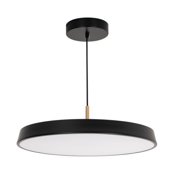 Подвесной светильник. Мощность 37 Вт, св. поток 3071 лм, 83 лм/Вт, теплый 3000 K, CRI>80, угол 120°, напряжение питания 230 В. Черный круглый корпус из стали, экран PMMA, степень защиты IP20. Размер: диаметр 500 мм, высота 50 мм, размер чаши: диаметр 160 мм, высота 35 мм. Монтаж подвесной, длина подвеса 1200мм. пульсация <5%.