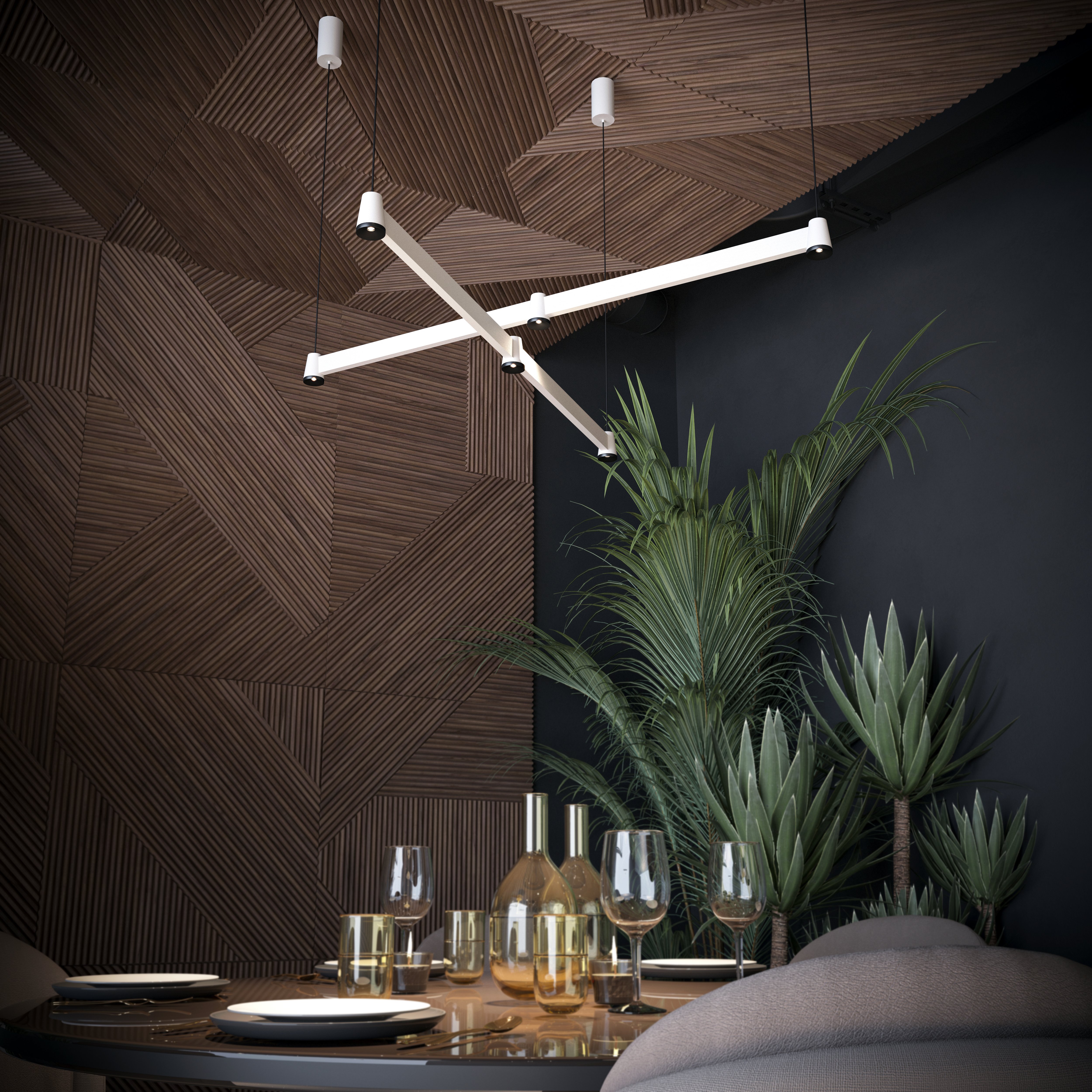 Минималистичный подвесной светильник мощностью 16 Вт. 3 световых модуля с теплым белым цветом свечения (3000 К) обеспечат локальное освещение с высокой световой эффективностью. Светильник подходит как для жилых, так и офисных помещений: интересно будет смотреться над обеденными и рабочими зонами, а также над столами для переговоров. Узкий угол излучения 35°, высокий индекс цветопередачи (CRI>90) и световой поток 1010 лм для качественного декоративного освещения. Минимальный коэффициент пульсации (менее 1%) гарантирует зрительный комфорт. Драйвер в комплекте для подключения к сети 230 В. Простая установка и регулируемый трос длиной 1300 мм сделают использование светильника комфортным.