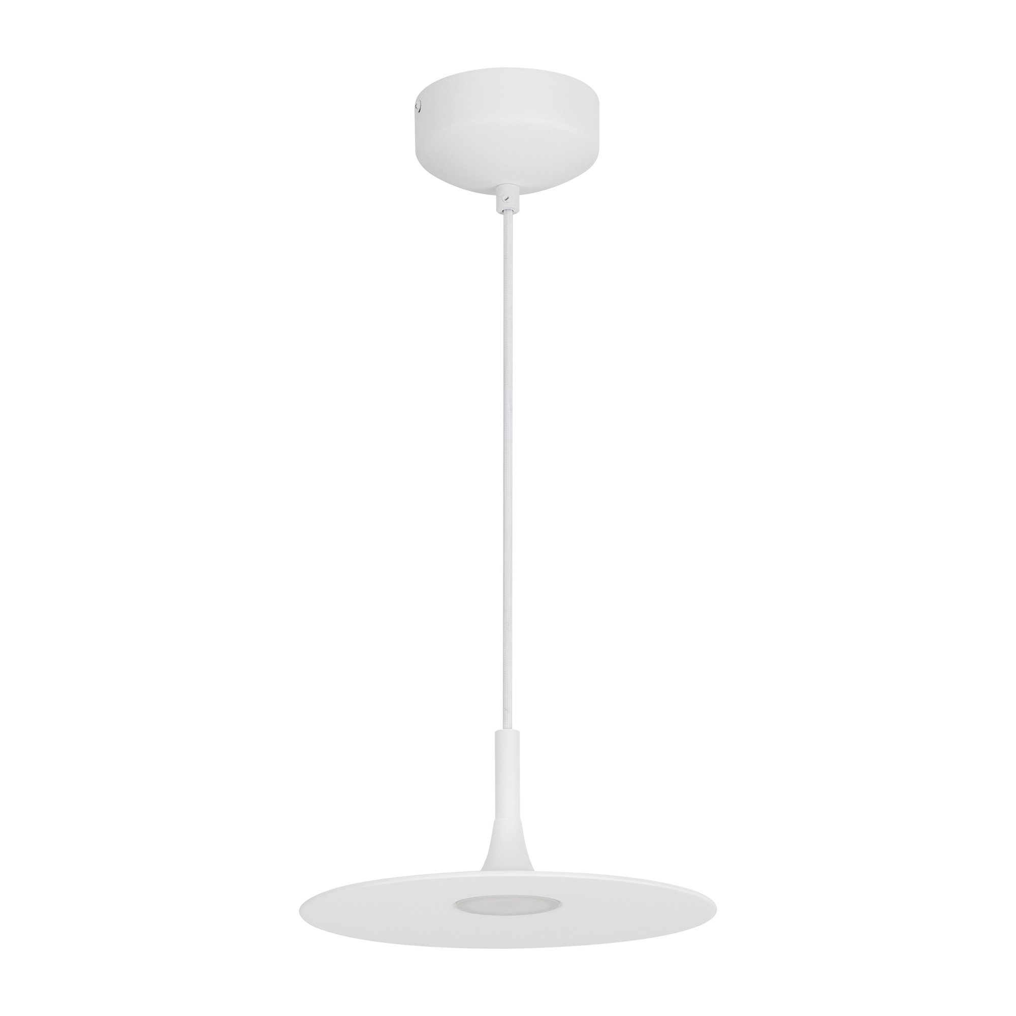 Подвесной светильник. Мощность 8 Вт, св. поток 525 лм, 70 лм/Вт, дневной 4000 K, CRI>90, угол 120°, напряжение питания 230 В. Белый круглый корпус из алюминия, рассеиватель каленое матовое стекло , степень защиты IP20. Размер: диаметр 250 мм, высота основания 64 мм, общая высота 108 мм. Монтаж подвесной, длина подвеса 1500 мм, регулируемая. Габариты чаши Ø120x75 мм. Драйвер 14-24 В, 300 мА, пульсация <5%.