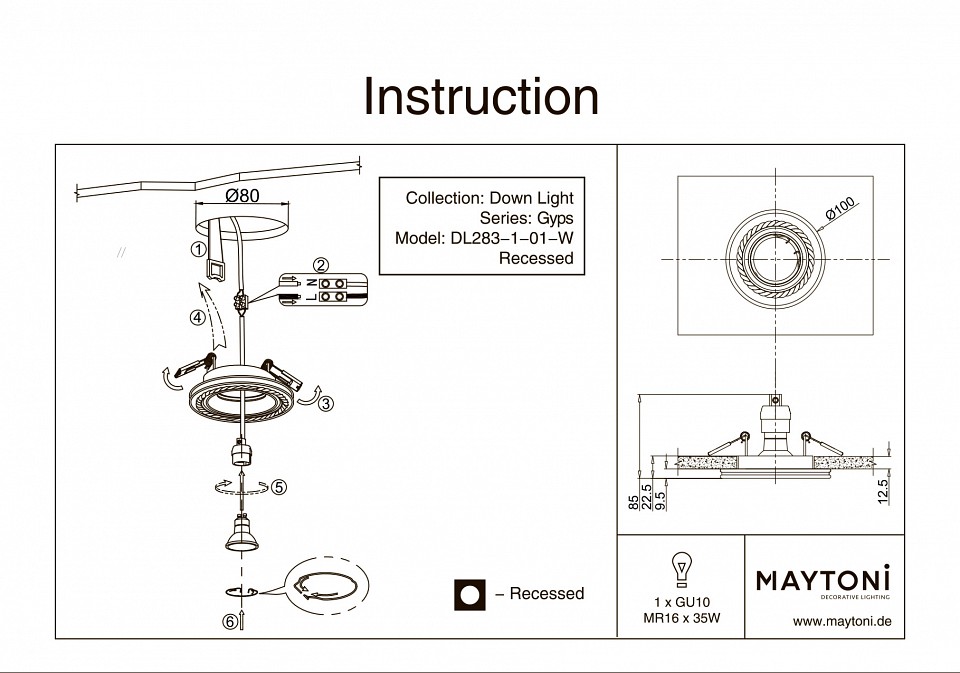 Встраиваемый светильник DL283-1-01-W Maytoni Gyps Classic. Немецкий бренд Maytoni хорошо известен европейским потребителям и завоевал особую популярность в России. Покупатели ценят в продукции бренда высокое качество, исключительную безопасность, использование современных экологичных материалов. Отдельно отмечают фирменный стиль Maytoni, в нем функциональность дополняется удобством пользования, а дизайн соответствует современным тенденциям.