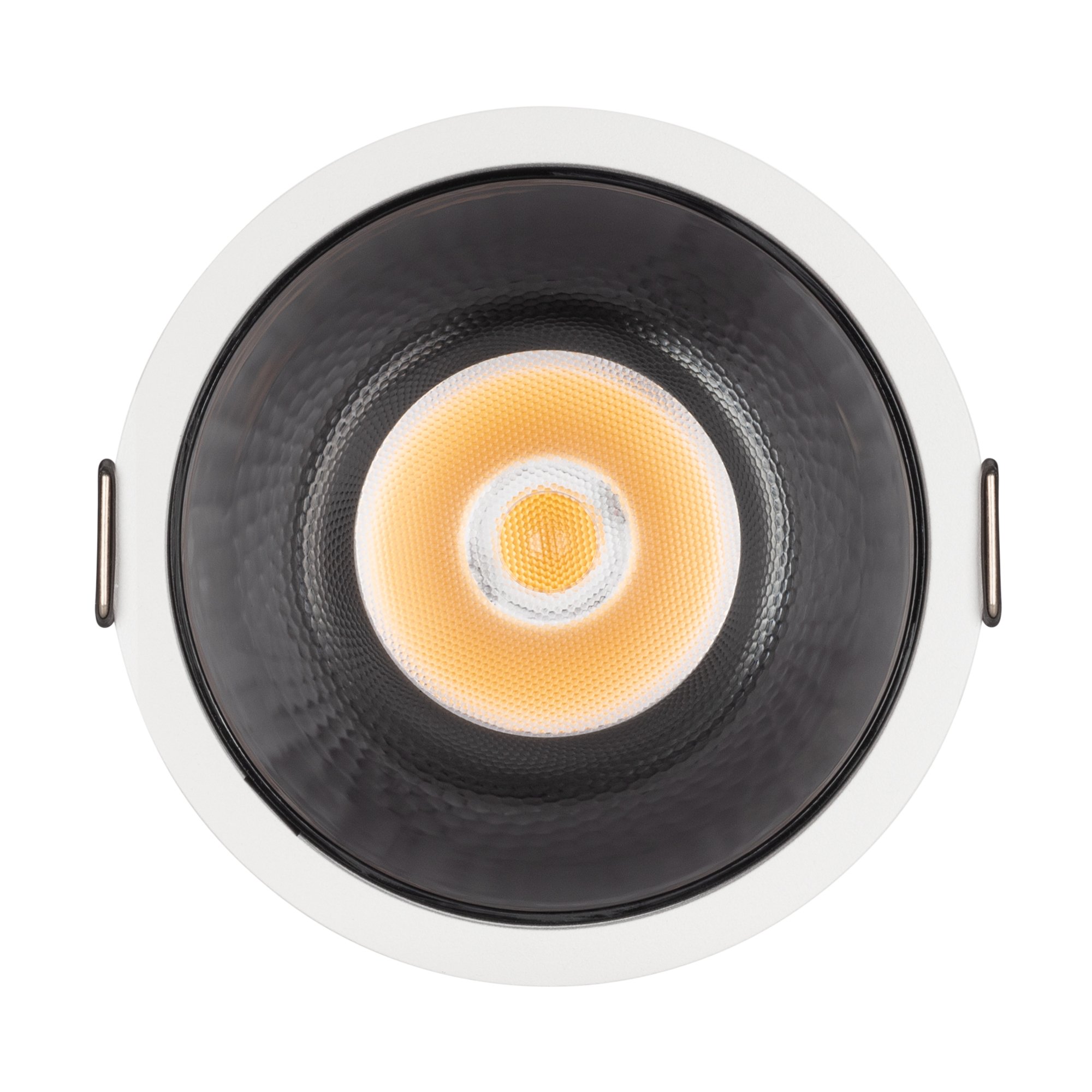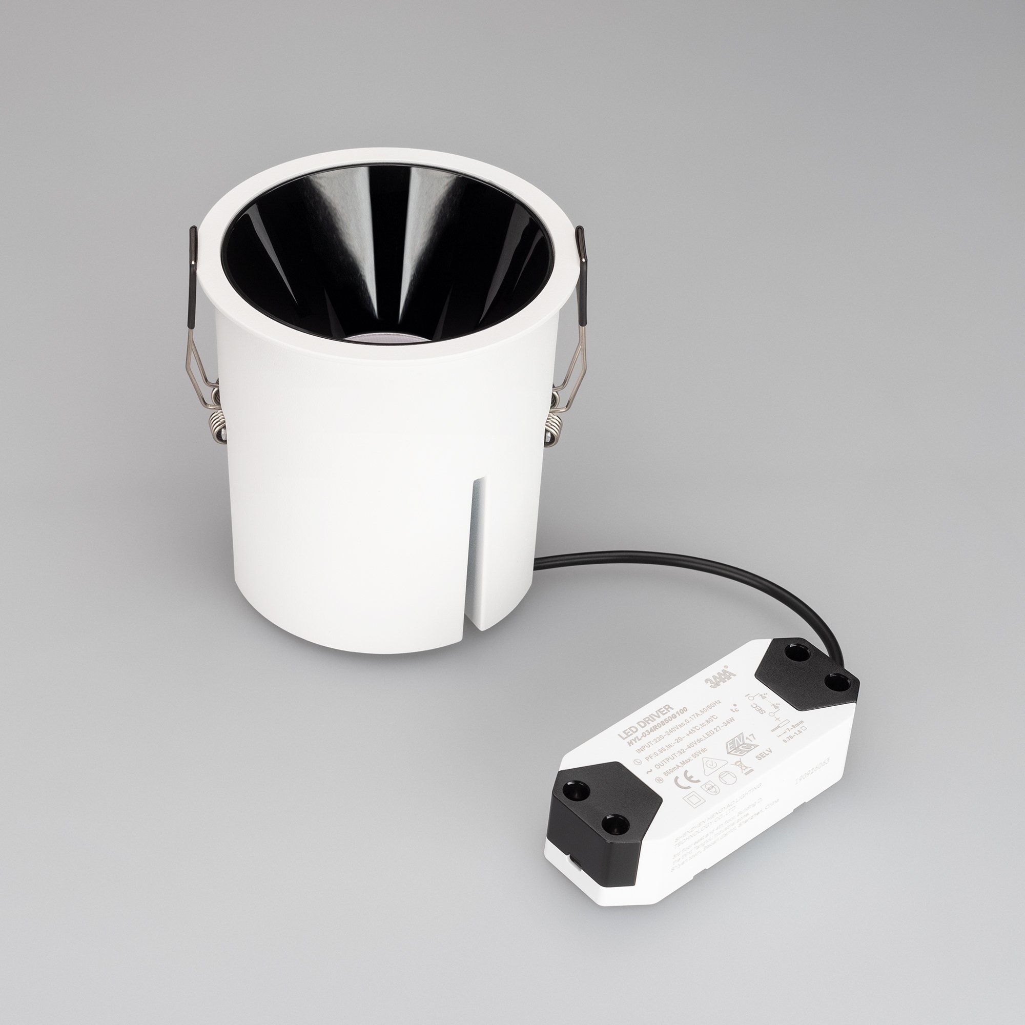 Встраиваемый светильник даунлайт. Мощность 32.8 Вт, св. поток 3280 лм, 100 лм/Вт, дневной 4000 K, CRI>90, UGR<16, угол 30°, напряжение питания 230 В. Белый круглый корпус из алюминия, степень защиты IP20. Размер: диаметр 112 мм, высота 114 мм. Монтаж встраиваемый, установочное отверстие: диаметр 105 мм. Драйвер 32-40 В, 850 мА, пульсация <2%.