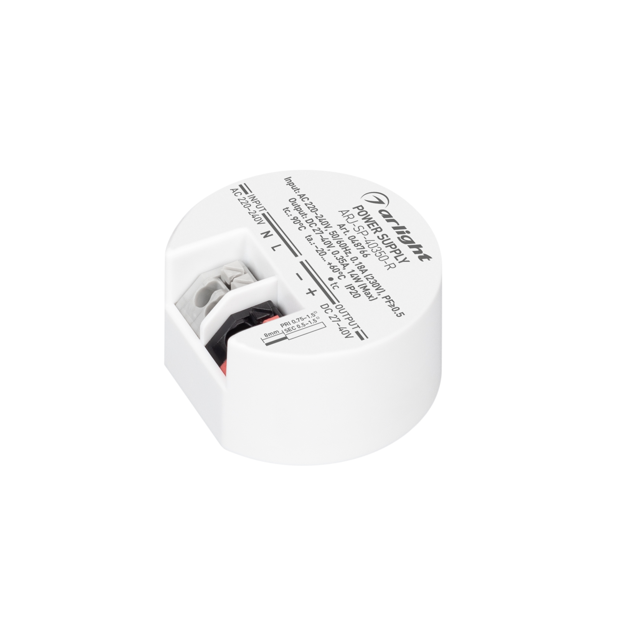 Источник тока с гальванической развязкой для светильников и мощных светодиодов. Входное напряжение 220-240 VAC. Выходные параметры: 27-40 В, 350 mА, 14 Вт. Негерметичный пластиковый корпус IP 20. Габаритные размеры диаметр 42 мм, высота 21 мм. Гарантийный срок 5 лет.