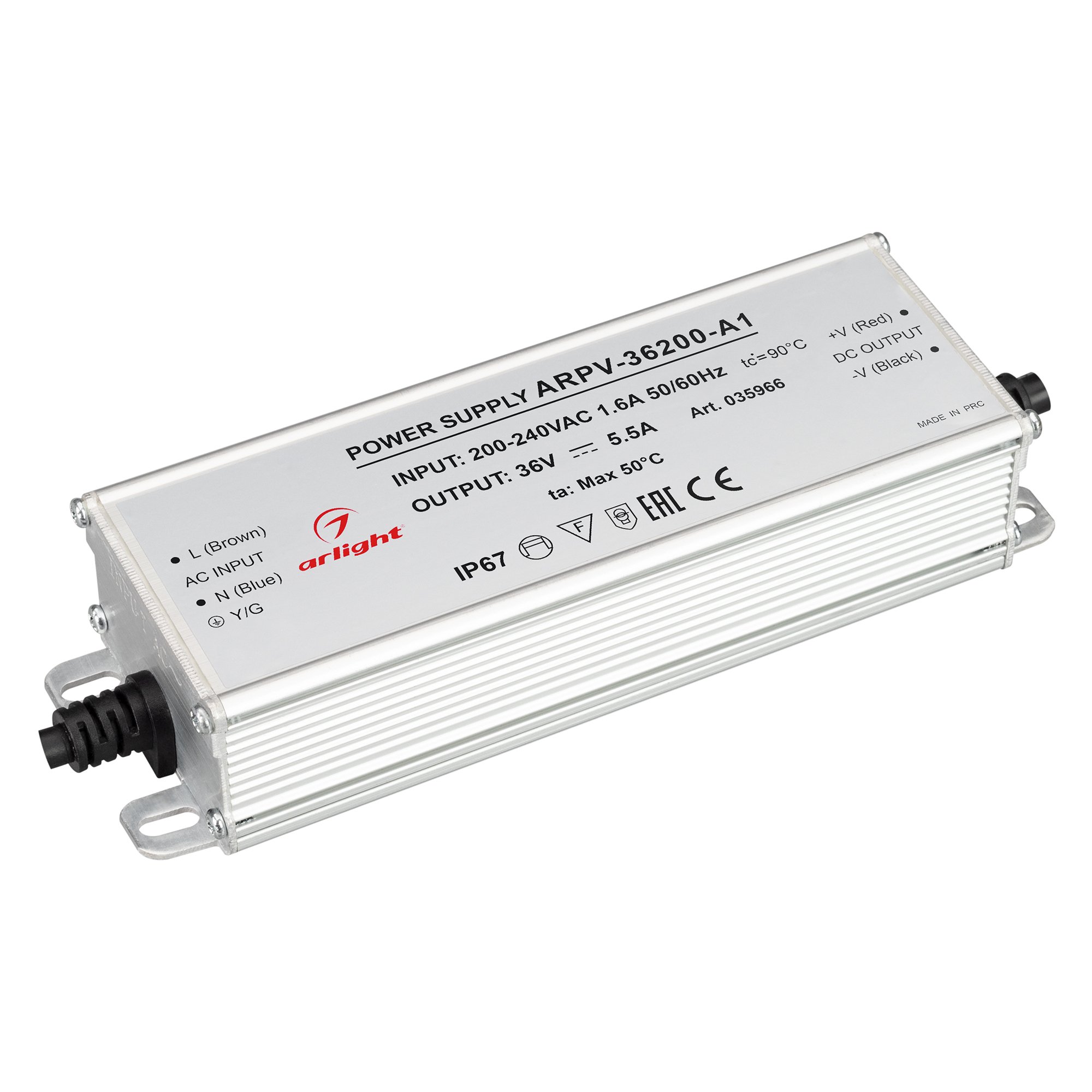Источник напряжения с гальванической развязкой для светодиодных изделий. Входное напряжение 200-240 VAC. Выходные параметры: 36 В, 5.55 А, 200 Вт. Встроенный PFC >0,5. Герметичный алюминиевый корпус IP 67. Рабочая температура -40…+70C⁰. Габаритные размеры длина 174 мм, ширина 56 мм, высота 36 мм. Гарантийный срок 3 года.