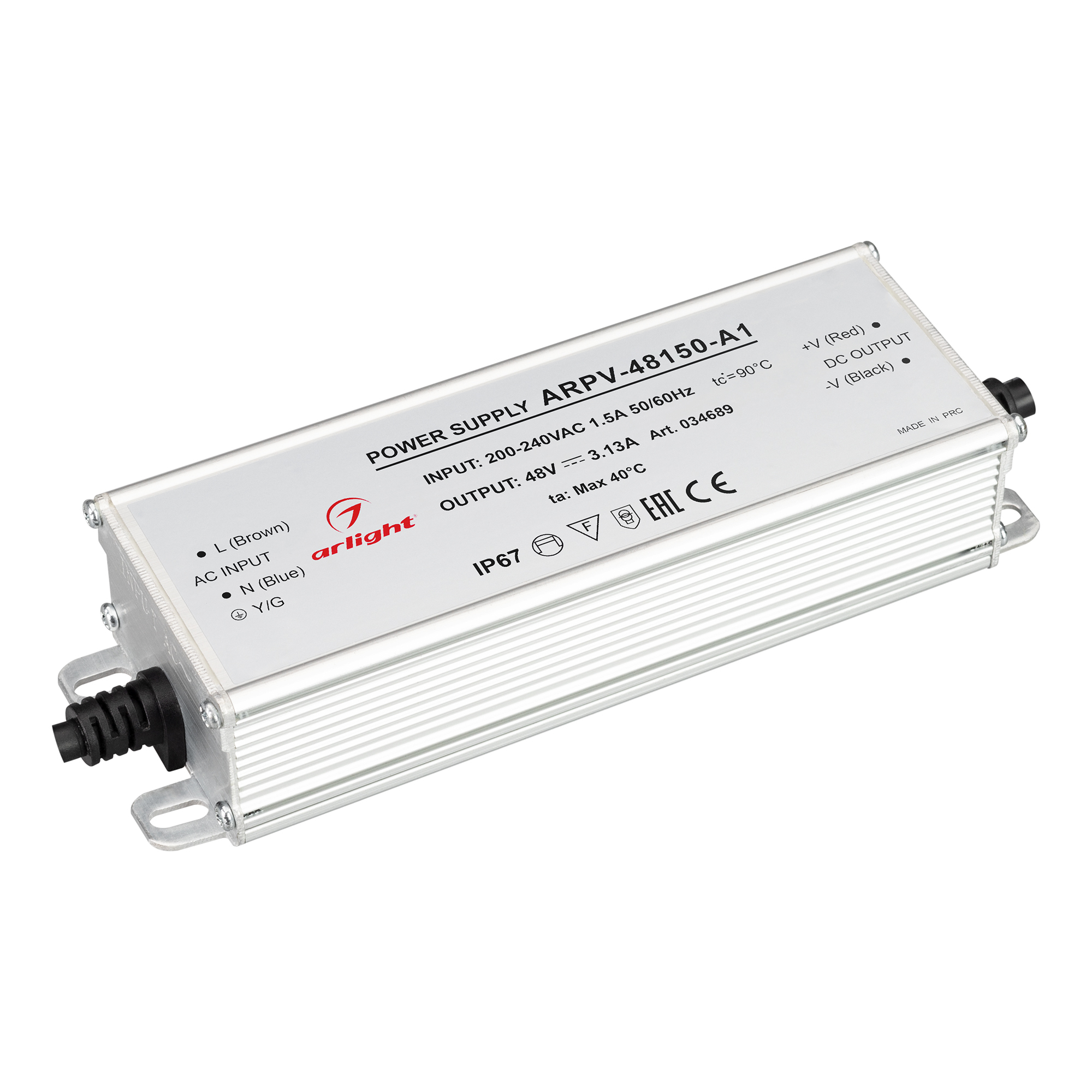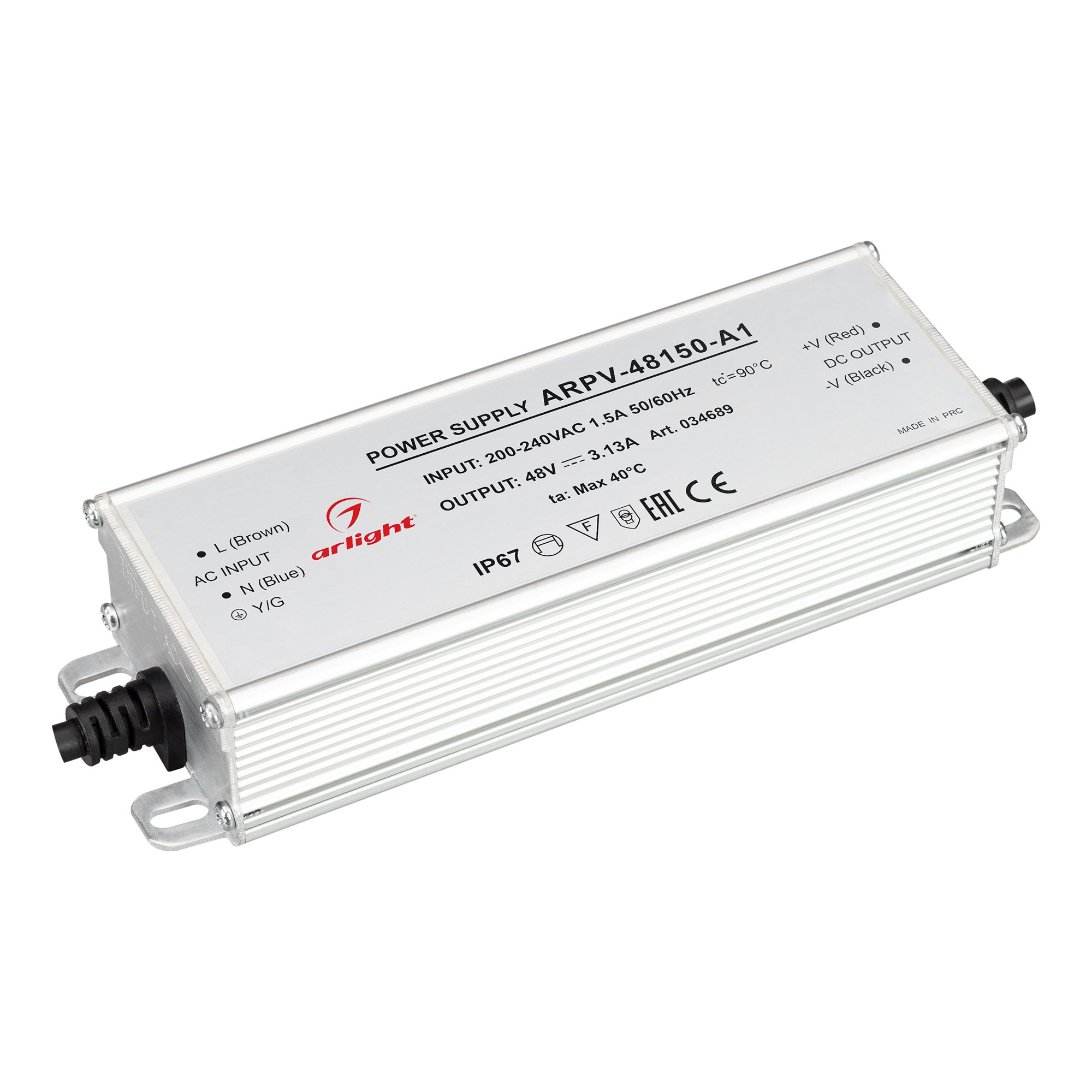 Источник напряжения с гальванической развязкой для светодиодных изделий. Входное напряжение 200-240 VAC. Выходные параметры: 48 В, 3.13 А, 150 Вт. Встроенный PFC >0.5. Герметичный алюминиевый корпус IP 67. Рабочая температура -40…+70C?. Габаритные размеры длина 174 мм, ширина 56 мм, высота 36 мм. Гарантийный срок 3 года.