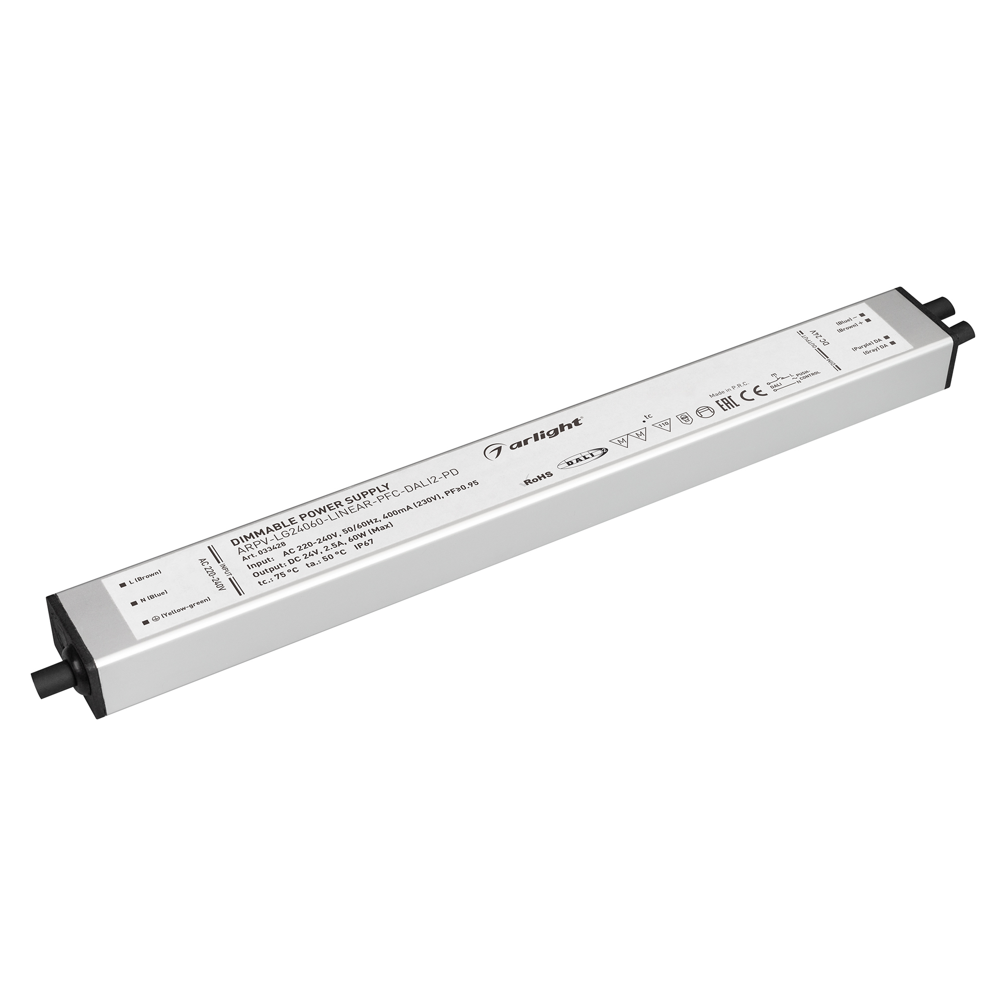 Диммируемый по цифровому протоколу DALI-2 источник напряжения с гальванической развязкой применяется для питания различных типов светодиодных изделий. Имеет широкий диапазон диммирования. Металлический линейный корпус обладает хорошим теплоотводом и может применяться для встраивания в алюминиевый профиль или нишу. Высокая степень влагозащиты IP67 позволяет использовать устройство как внутри, так и вне помещений, с соблюдением правил и требований к установке. Встроенный корректор коэффициента мощности позволяет снизить реактивную мощность источника питания, что положительным образом отражается на количестве потребляемой энергии. Высокая эффективность и расширенная гарантия 5 лет - основные преимущества линейки ARPV-LG-LINEAR.
