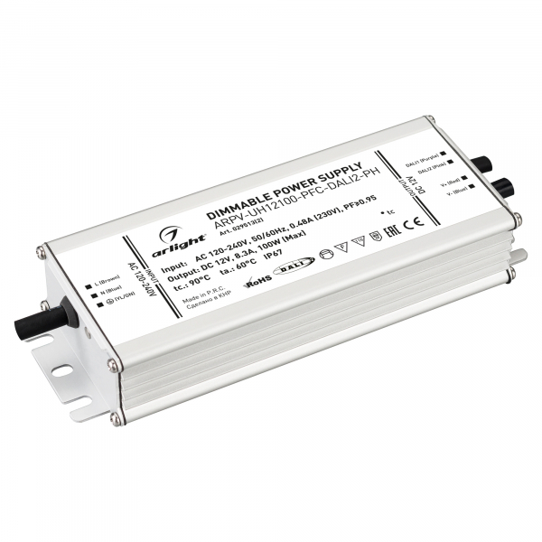 Диммируемый источник напряжения по протоколу DALI2.0 с гальванической развязкой для светодиодных изделий. Входное напряжение 120-240 VAC. Выходные параметры: 12 В, 8.3 А, 100 Вт. Встроенный PFC >0.95. Герметичный алюминиевый корпус IP 67. Рабочая температура -40…+70C⁰. Габаритные размеры длина 188 мм, ширина 67.5 мм, высота 33.5 мм. Гарантийный срок 7 лет.