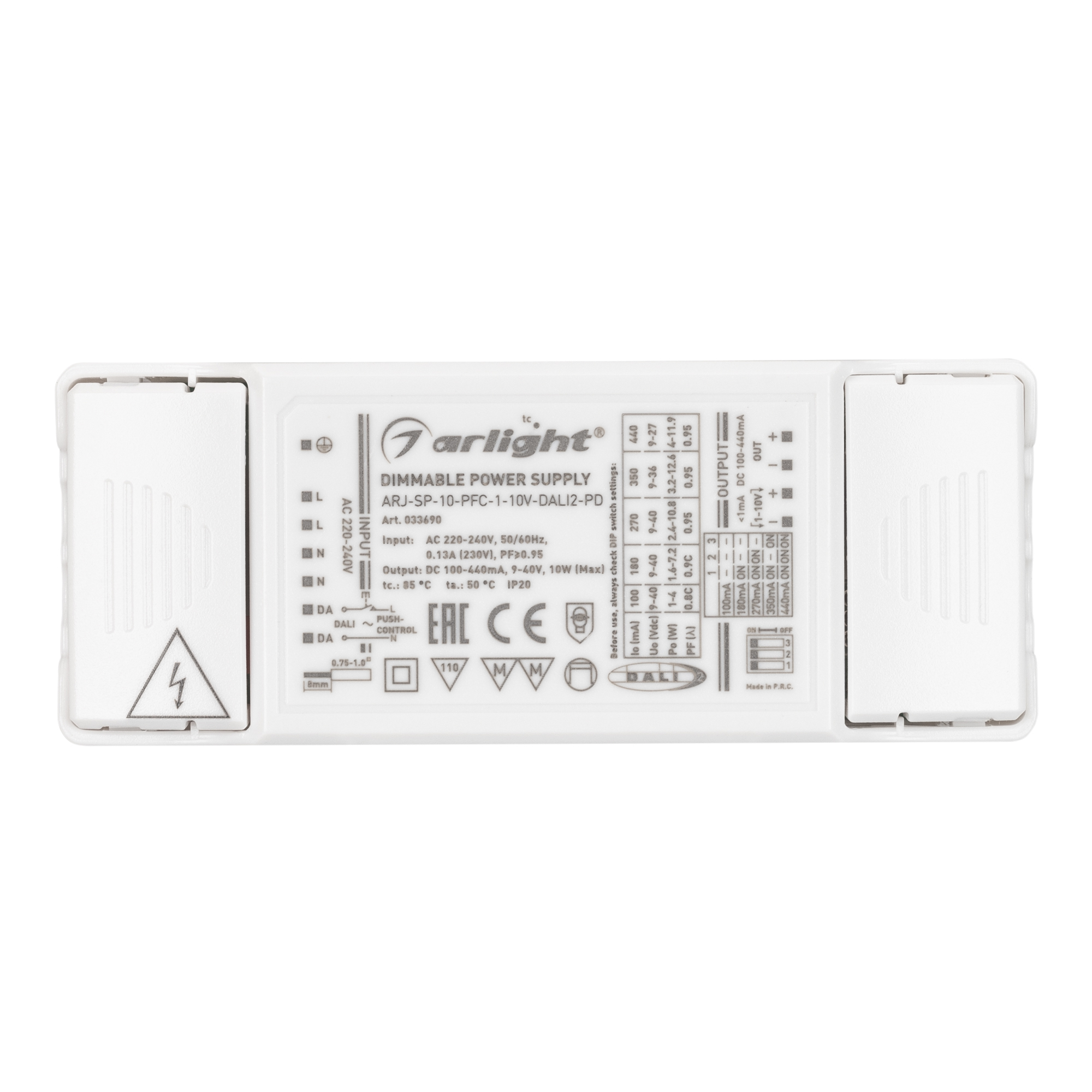 Диммируемый мультитоковый блок питания с управлением DALI 2.0 (диапазон 0.1-100%) и 1-10V (диапазон 2%-100%) с гальванической развязкой. Функция PUSH DIM. Сертификат CE (EMC+LVD). Входное напряжение 220-240 VAC. Выходные параметры: 9-40В (100/180/270мА), 9-36В (350мА), 9-27 (440мА), максимальная мощность 14Вт. Выбор значения тока осуществляется DIP-переключателем. Встроенный PFC >0,95. Негерметичный пластиковый корпус IP 20. Габаритные размеры длина 120, ширина 46 мм, высота 23.8 мм. Гарантийный срок 5 лет.