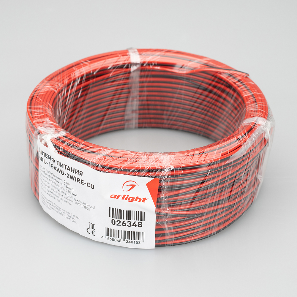 Шлейф для питания и управления одноцветными светодиодными лентами. 2 проводника, калибр проводника 18AWG, сечение проводника 0.84 мм², проводник из луженой меди, внешняя оболочка из ПВХ красного и чёрного цветов. Длина кабеля в бухте — 50 метров.