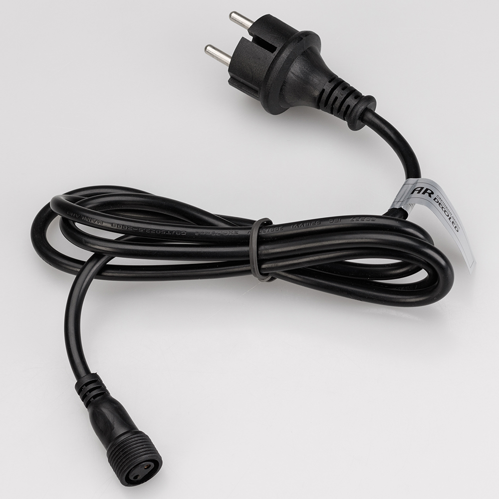 Шнур питания специально разработан для подключения светодиодных гирлянд с эффектом мерцания (FLASH). В комплект входит шнур питания с вилкой европейского стандарта (IP44), 2pin разъем для подключения к гирлянде, а также выпрямитель AC/DC (1.6А). Оболочка из белого ПВХ придает ему элегантный внешний вид. Длина провода составляет 1,5 метра, что позволяет удобно располагать гирлянду.
