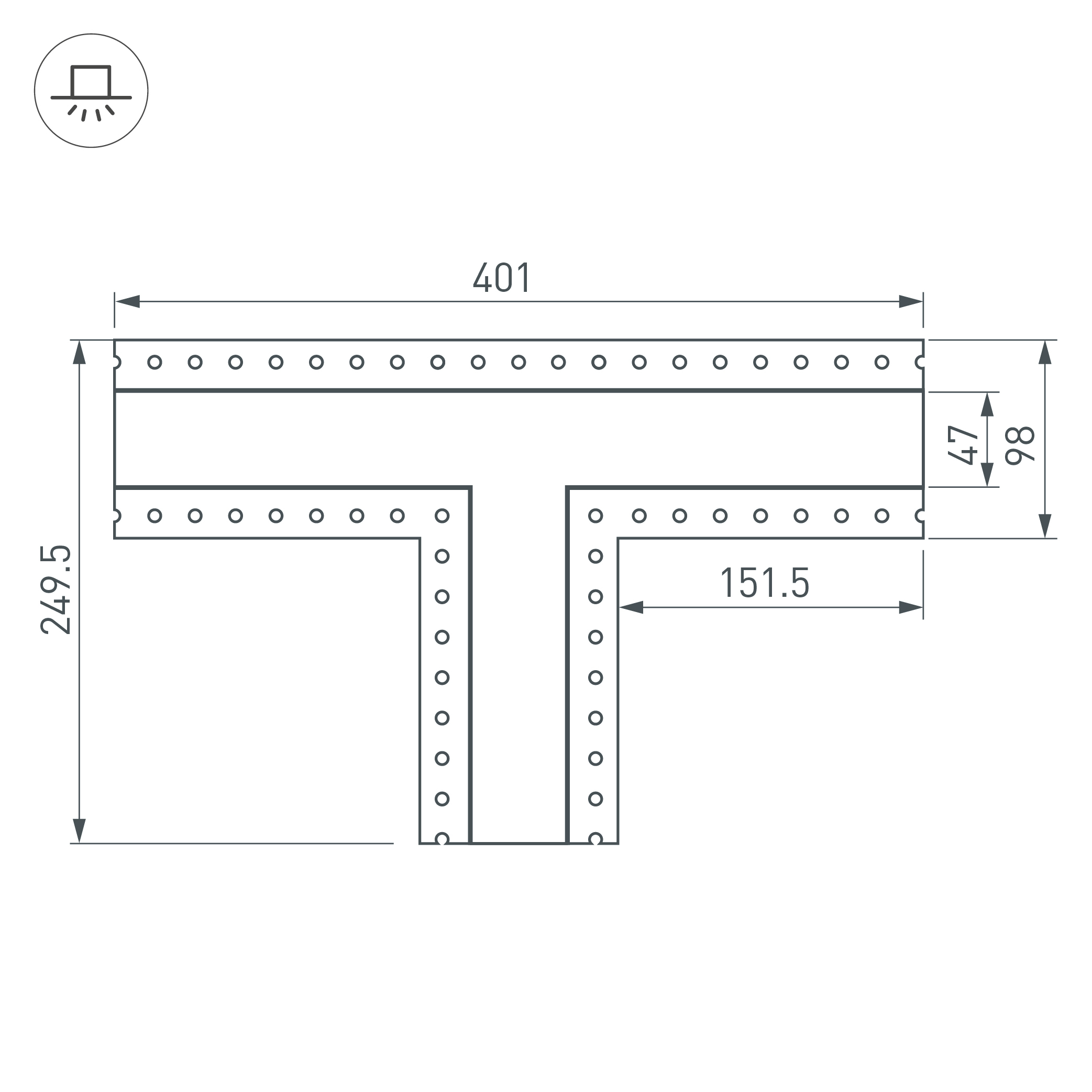 Т-образный угол в сборе со скрытым фланцем под строительную отделку для соединения трех профилей SL-LINIA45-FANTOM под прямыми углами 90° в одной плоскости в комплекте с матовым экраном и соединителями. Экран образует Т-образную фигуру на плоскости. Применятся при изготовлении светильников сложной геометрии.